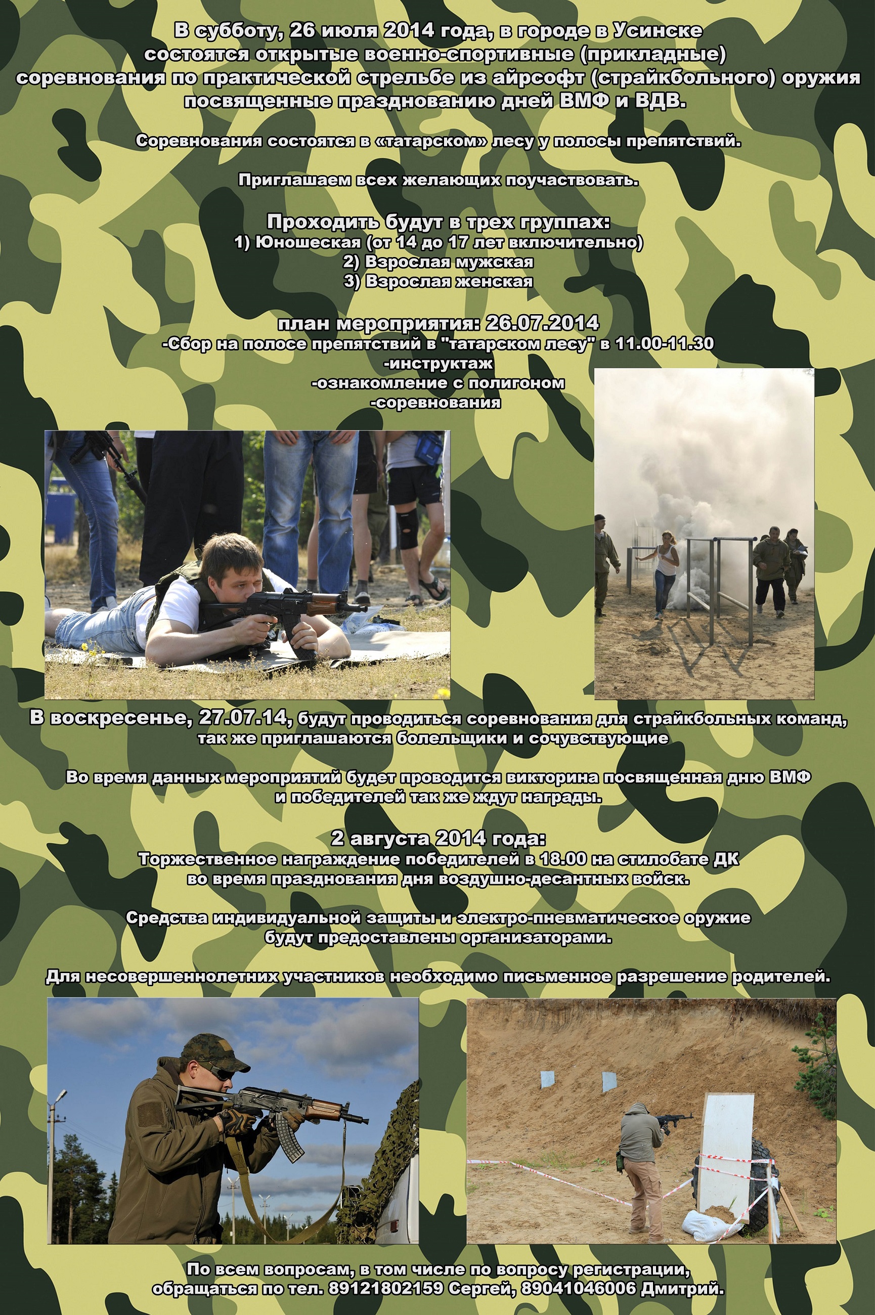 28 июля 2013 в городе в Усинске состоятся открытые военно-спортивные (прикладные) соревнования по практической стрельбе из айрсофт (страйкбольного) оружия посвященные дню ВДВ. Соревнования состоятся в «татарском» лесу у полосы препятствий.
