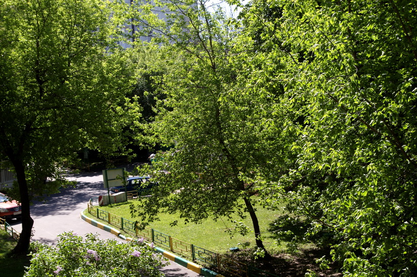 Стоянка автомобилей,ничего особенного,иногда вылажу на ТТэшку полюбоваться.А вот с другой стороны дома всегда тепло солнце,лавочка под балконом,там уже повеселее (5 этаж).Щас у нас погода хмурая,гнустная,а вообще я постоянно сплю в комнате где выход на солнечную сторону и постоянно меня будет солнце,светя своими лучиками прямо в глаза,просыпаюсь с хорошим настроением.