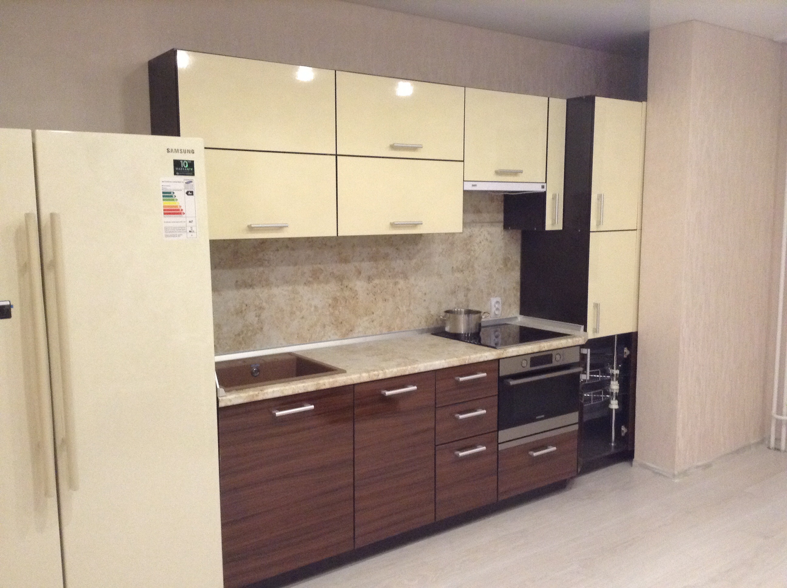 Покумекав над дизайном и функционалом мы остановились на проекте в котором одна ниша просто будет закрыта холодильником (на роликах он будет выдвигаться когда нужен будет доступ в нишу), а во второй будет встроенный пенал с карусельной системой. Из техники решили всё необходимое брать раз пошла такая "пьянка": Воздухоочиститель Krona Kamilla 600 (даа мотора) надеемся прокачает наши 16 квадратов :-). Духовой шкаф Samsung FQ159STR (с функцией СВЧ, чтоб отдельно не покупать микроволновку) Варочная панель Hotpoint Ariston KIO 642 (индукция) Посудомойка Bosch (модель не помню) Столешница пластик. От каменной отказались так как она значительно дороже и по рекомендациям знающих людей царапается (потом надо полировку заказывать). Фартук, или экран - обычный. От стеклянного так же отказались в виду дороговизны и по причине того что надо будет с таким очень аккуратно быть (стекло есть стекло). Из плюшек. Очень удобные подъемные механизмы. На фото покажу как закончим собирать. Сам гарнитур нам обошелся вместе с лоставкой и установкой семдесят с небольшим. И это с учетом моих всевозможных потуг с экономией (сам поднимал, часть сам устанавливал и т.д.). Техника не помню сколько (цены есть в Яндекс.Маркет). Технику кстати старался брать со скидками или по акциям. -------------------- "Я люблю этот город, но зима здесь слишком длинна" (С)
