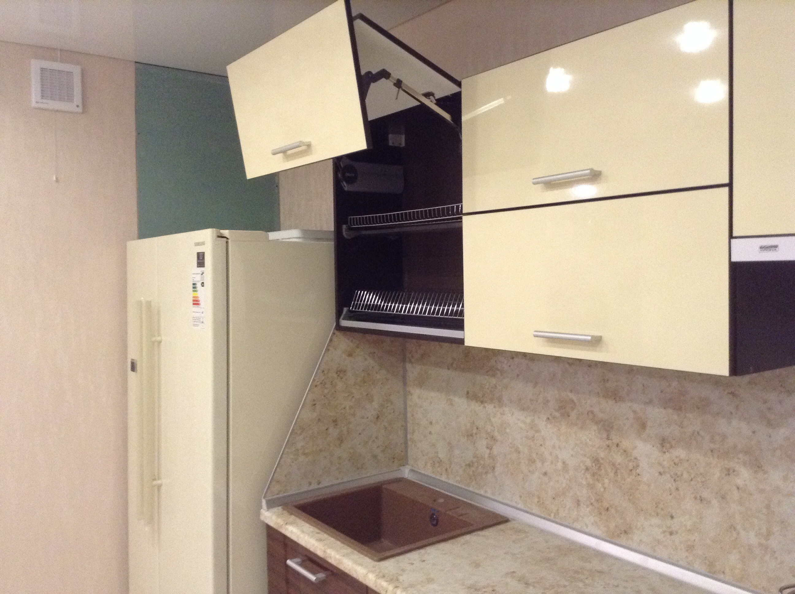 отвод на вытяжку нужно было сразу продумать. Я так понимаю вентиляция у тебя вот та с права? Туда если делать то коробом специальным....покажу как у меня. Ну или как вариант выводить на улицу...но это до установки кухни нужно было.
