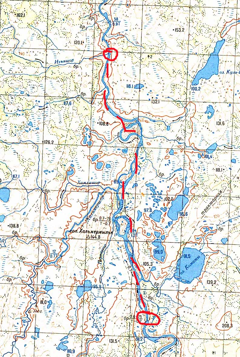 Ночь и утро дождь, сильный ветер. На озере метровая волна и белые барашки. Плыть - риск перевернуться или вымокнуть до нитки. До обеда ждем. Дождь успокоился, ветер нет. Понятно одно - застряли еще на один день. Взял спиннинг и пошел искать рыбу. Незаметно как-то погода стала улучшаться, но я уже обошел 1/4 часть озера. По времени сегодня уже все равно не успеем, поэтому пошел дальше. Когда был уже на противоположной стороне увидел Колю, который греб ко мне. Рыба ловиться стала хорошо. Самые удачные места пометил красным крестиком. Ветер успокоился, рыба стала гулять, тем самым себя выдавая. Противоположный берег мелкий. Зашел глянул ручей, который выходит из озера и впадает в реку Монисей-яха. Ручей хороший, узкий, но глубокий, для байдарки в самый раз. Подплыл Коля. Сказал, что поднимался на Б.Манисей, сделал съёмку, нашел в турике записку оставленную москвичами и уплыл. Я обошел озеро до конца. Нашел святилище, посмотрел. На берегу стоит камушек обмотанный ленточками и тряпками, а на бугре склад рогов, черепов, бутылок, банок, всего что блестит. Вернулся в лагерь. Рыбы поймал около 10 кг, жарили 3-4 дня. В общем были все надежды завтра отсюда уплыть. Но вечером опять зарядил дождь. В этот раз перед походом я как и перед маршрутом на Сарьюгу купил блокнотик и ручку в киоске Ж/Д вокзала г.Печоры. Уж слишком тоскливо было мне тогда одному, поэтому вел дневник путешествий. А вот в этой компании как-то скучно не было. Но вот именно в этот день, когда мы мокнем третьи сутки и сидим в палатках я от скуки исписал 3 листа. Это была единственная запись в дневнике путешествий. Публиковать её смысла нет, обида на непогоду и общие описания по маршруту. В общем уснул. И снилось мне наверное, что завтра я обязательно сделаю снимок "Полярной Италии" - мысок в озере с северной стороны в виде сапожка. Его видно на фото которое сделал Коля с вершины. Красным кружочком обвел место с палатками. Синий крестик - святилище. -------------------- Настоящему индейцу завсегда везде ништяк!