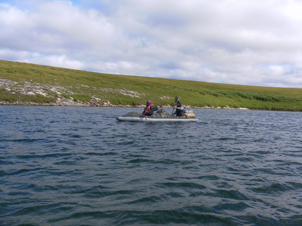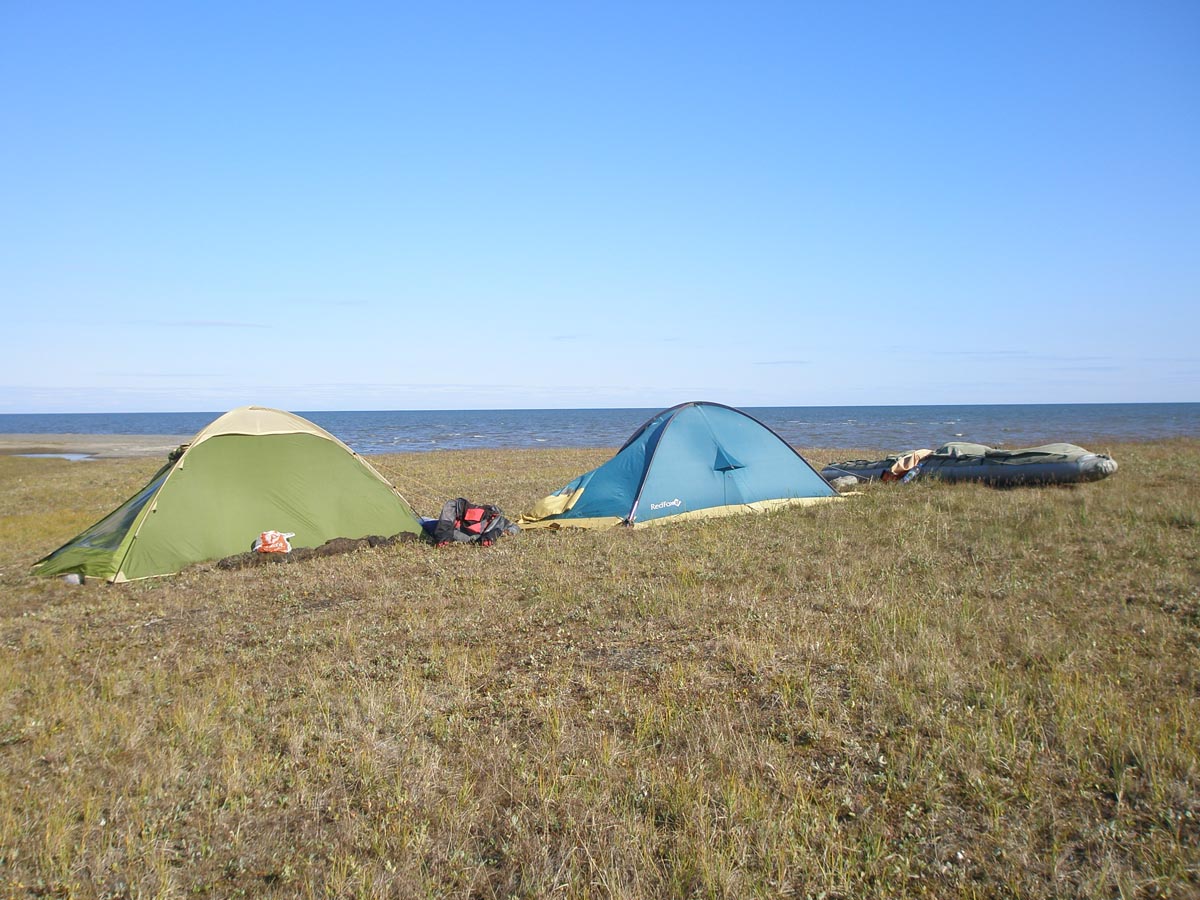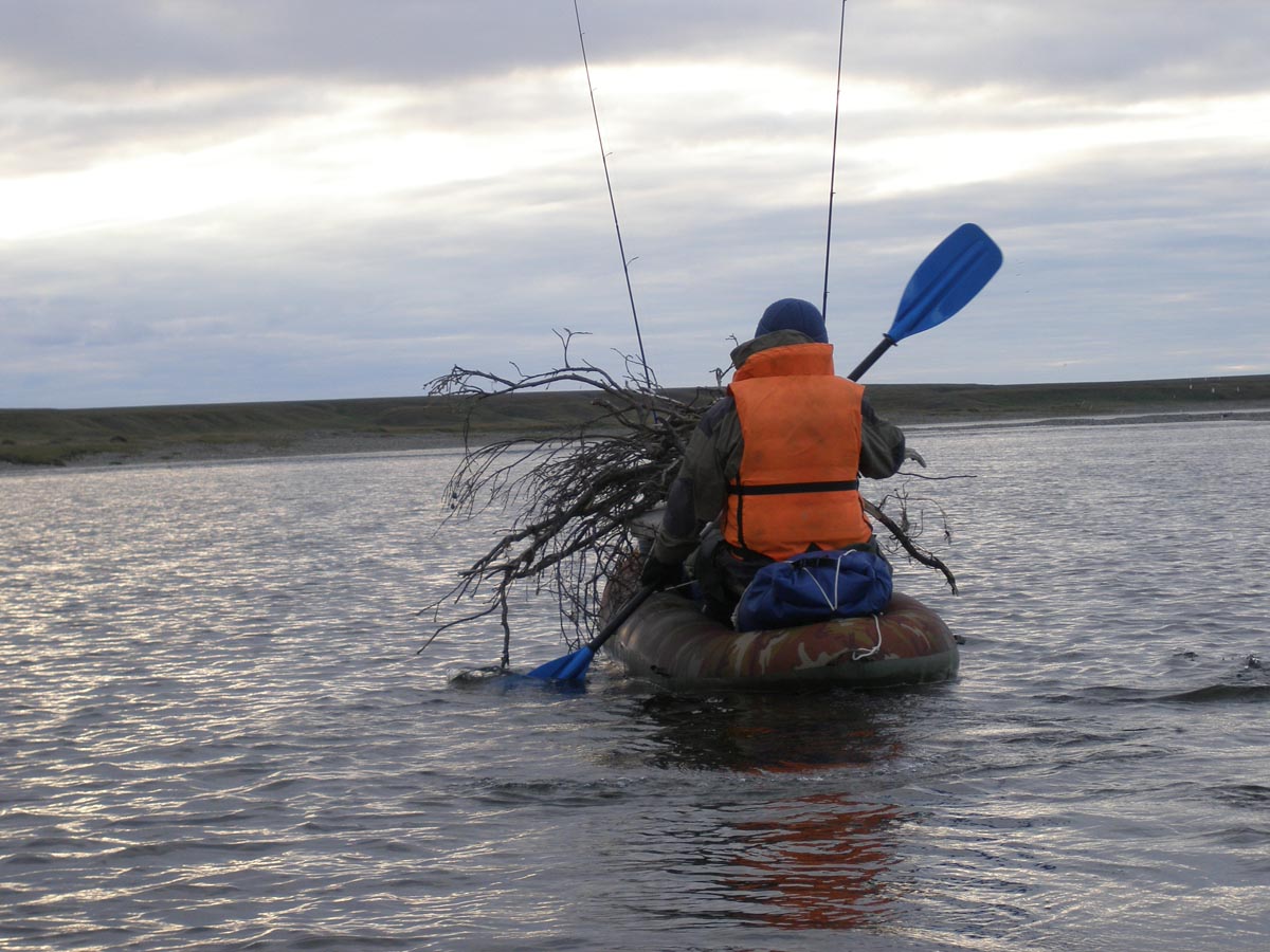 С утра прогулялся по озерам, которые были рядом с местом ночлега. Мелкие лужи, с глубиной по колено, без рыбы. Ближе к морю нашел плантацию золотого корня, немного капнул для гостинцев. К обеду вышли в море. Море мелкое, постоянно веслом цеплял дно. На пологих пляжах есть дрова - топляк принесенный из рек и выброшенный штормом. Стволы хорошо просушены, костер с них получается отменный. Пока Коля рубил дрова я сидел и чистил картошку. Тушенки и сырокопченой колбасы у нас уже не было несколько дней, варили суп из пакетов. Пока разбирался с картошкой внимание привлекла жестяная банка в песке. Лежала к верху крышкой. Сижу смотрю и думаю: "Неужели целая?". Подошел и ковырнул ногой. Банка целая, этикетки нет, даты изготовления тоже. Открыли, оказалась свиная тушенка. Попробовал на вкус - нормалёк! Боженька сделал нам подарок, который пустили в суп. Сколько лет она там пролежала неизвестно, но в условиях севера читал что на Аляске ели тушенку с царскими гербами. В общем не отравились. Пока пообедали лодки оказались на 4-5 метров на берегу от воды. Смекнули, что начался отлив. Нужно было срочно дергать. Графика приливов-отливов мы не знали, Коля сказал что между ними должно быть 6 часов. То есть в сутки 2 прилива и два отлива. Прилив-отлив днем и прилив-отлив ночью. Когда начался этот не известно, просто засекли время. Отошли от берега и налегли на весла, берег стал отдаляться, а вместе с ним ушла вода и мы оказались по колено в грязи в 100 метрах от берега. Пришлось срочно выходить на берег. Это оказалось не так легко по жидкой грязи по колено, которая засасывает. В общем создалось впечатление, что кто-то выдернул крышку в канализации и слил воду с нашего бассейна. Вылезли на берег в районе старой рыболовной избы, которой уже давно там нет, но есть остатки в виде бревен и ржавой посуды. Километровой карты этого района нет, шли по той что была в 1 см 2 км. Успели пройти 10,8 км. -------------------- Настоящему индейцу завсегда везде ништяк!
