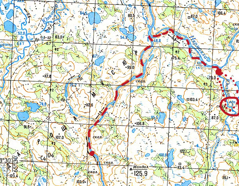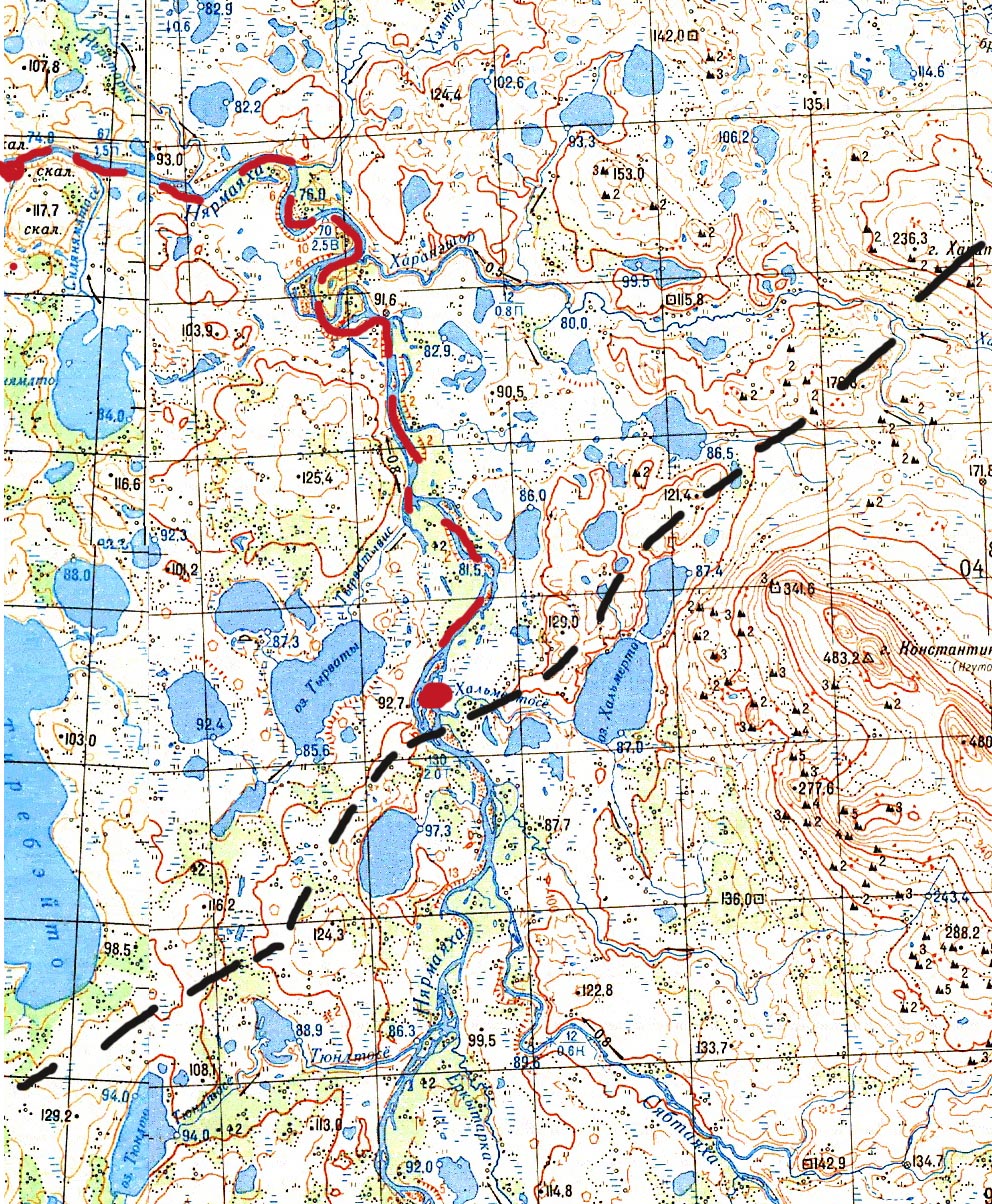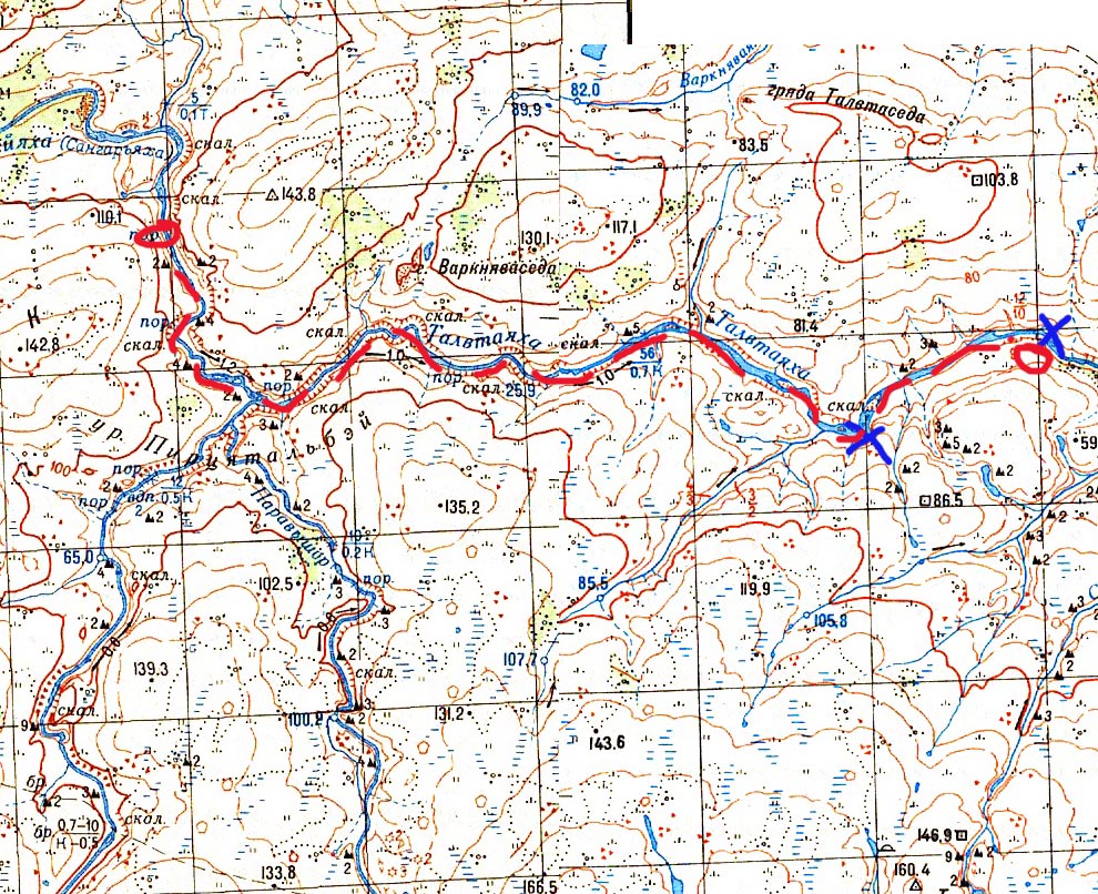 С Колей Александровым и его женой Татьяной мы познакомились заочно, еще до нашего первого визуального знакомства. Я читал его похождения по Уралу и Тиману. В 2011 году нас познакомил Якут (Виталий Шурухин) на р.Заостреная, за что ему как "грится" отдельное спасибо. Шли тогда параллельными курсами, но это не помешало нам сдружиться. Наблюдал за их отчетами по Карелии и Сибири. В 2013 году приглашал в гости в Усинск на выставку "Мои маршруты", которую проводил наш турклуб "Азимут-Север". Коля привез тогда с собой несколько своих фильмов, которые месяца 3 я не мог посмотреть сам, т.к. они гуляли по городу и переписывались всей туристической собратией))) Зимой 2014 года, когда я строил планы на лето, то получил предложение от Николая прогуляться по Южной части Югорского полуострова в районе Полярного Урала. Изначально было запланировано 2 варианта маршрута, один в районе д.Каратайки с выходом в Баренцево море и запасной - северо-восточнее Воркуты с выходом в Карское море. Оба маршрута были интересны тем, что там есть участки "первопрохода" не описанные туристами. На обоих маршрутах реки текут в живописных каньонах с порогами и водопадами. Так же очень привлекала возможность лососевой рыбалки. Но, по мере подготовки основной вариант отвалился по причине того, что Ютейр перестал летать из Усинска в Нарьян-мар. Воркутинский вариант был доступнее и бюджетнее. Вопросы с пропуском в погранзону нам помогла решить в Нарьяне наша форумчанка Оксанчик за что ей отдельное спасибо. Проблем с билетами в сторону Воркуты у нас не было, купили за неделю до отправки и 9 августа ( в 00.40 со ст. Печора) двинулись в дорогу. Для более понятного видения активной части маршрута прикладываю карту 1см=10км. Нитка маршрута целиком: г.Воркута-р.Кара-р.Нярма-яха-р.Сябта-яха-оз.Манисейто-р.Манисейтосё-р.Талвта-яха-Байдарацкая губа-КНС Ярынская-г.Воркута. С заброской на активную часть маршрута решили воспользовавшись услугами одного кадра из Воркуты. Напишу об этом подробно в конце, т.к. не хочется начинать свой рассказ с негатива. Сама заброска не представляет сложности. От г.Воркуты до побережья Карского моря идет грунтовая дорога, построенная Газпромом. Для проезда по ней нужно получить пропуск. (Выдают без проблем в офисе Газпрома). Нас просто грубо говоря развели, по причине того, что мы информацией не владели. Но не суть. 9 августа Прибыли в 10 утра в Воркуту. Выгрузившись с поезда, мы уже через 3 часа были на р.Кара в районе автомобильного моста. Отсюда и начинался наш маршрут. По дороге наблюдали из окна многочисленные посёлочки газовиков и проносящиеся мимо озера у подножия хребта Оченырд. Движение по трассе оживленное. Для одинокого туриста поймать попутку ничего не стоит. Здесь у моста стали перебирать и перекладывать вещи из рюкзаков в гермы, качать лодки и пообедали. Время отличается от Московского на +2 часа. Я это заметил глядя на навигатор, который перевел его автоматом. Вещей много. Мой груз при выходе из дома составлял 70 кг. У Коли с Таней на двоих было столько же. Я немного перебрал с мукой, солью и спиртом. Хотя последнего хватило только до середины маршрута)))) Продукты мы закупали по предварительно согласованному списку, с расчетом на 25 дней и с расчетом на троих. Единственно против чего был я, это против сухарей)))) (в итоге сломал таки зуб об сухарик) и в Воркуте купил 4 булки 