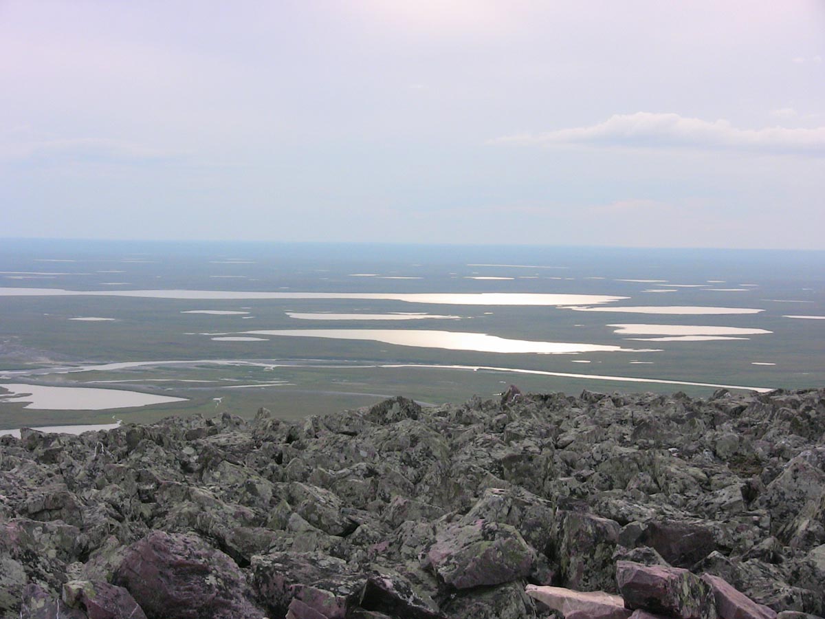 Хлеб у нас тут кончился, но вот в отчете белорусов они писали, что рядом в 6 км есть магазин, где они даже могли купить спиртное. Поэтому еще с вечера решили что устроим днёвку. Я с утра должен был разыскать магазин, а после обеда планировали сходить на восхождение на гору Константинов Камень - самую северную вершину Полярного Урала. Выйдя на дорогу разведка доложила, что никаких магазинов в округе, кроме как магазинчиков в рабочих поселках нет. Ближайший магазинчик 60 км, но спиртного там тоже не продают, во всех рабочих поселках охрана и сухой закон. В общем поймал попутку и полетел. Час туда, час обратно. Хлеба там тоже не продают, но зашел в столовую, принял вид кота из мульфильма Шрек "Граждане, помогите кто сколько может, сами мы не местные Вернулся в лагерь, день был жаркий и Коля с Таней даже купались, но я не рискнул. Пошли на восхождение. Из обуви у меня только калоши и бродни, почесав маковку, решил совершить восхождение в калошах))) Проходя мимо озер с Колей искупнулись, видели стоячие сети и 3 чума оленеводов в паре километрах от озера. На берегу нашел мертвую зельдь. При подъёме раз 5 попались зайцы, видимо бегут в горы от комаров. Поднялись быстро, часа за 3. На вершине множество сложенных туриков и труп белого оленя, принесенного местными в качестве жертвоприношения Войпелю (духу северного ветра). Есть у них такие места, к ним же относится и гора Большой Манисей и Еркусей (на Приполярном Урале). На спуск времени ушло меньше, успели до темноты. На Константиновом камне мой фотоаппарат умер окончательно. -------------------- Настоящему индейцу завсегда везде ништяк!