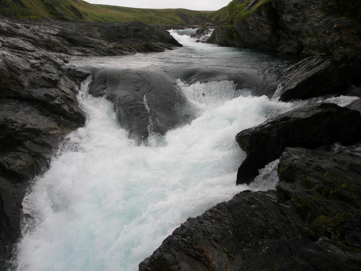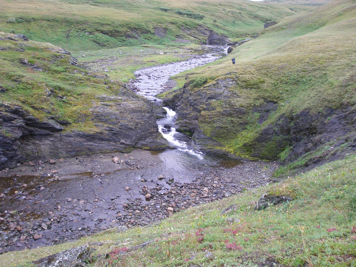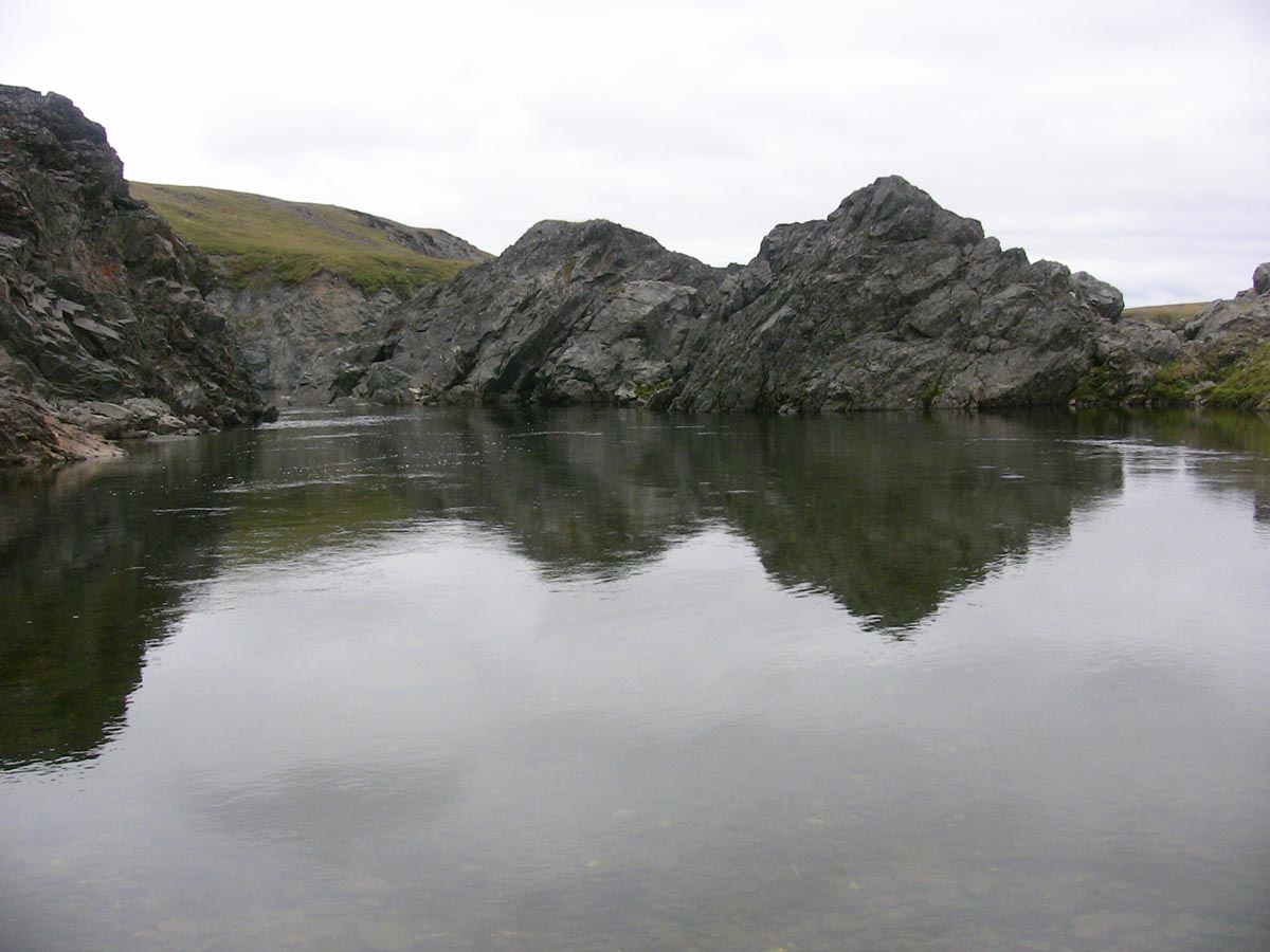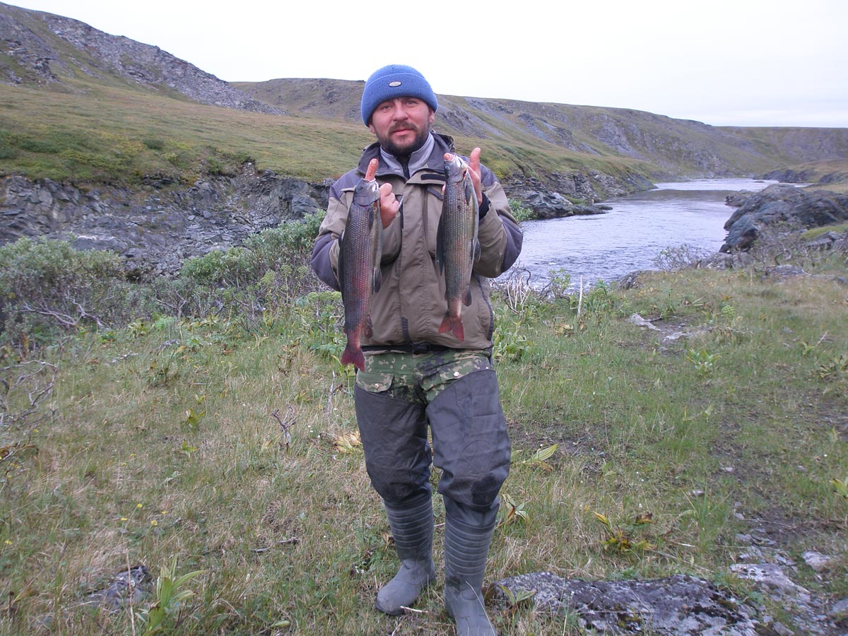 После второго водопада река довольно продолжительное время имеет довольно ровный путь, без петель и заворотов. Всю дорогу пробовал ловить рыбу и только к вечеру улыбнулась удача. Поймал таки 2 хариуса, взвесили 1,2 кг и и 1,4 кг. И всё! На ночь встали в довольно перспективном для рыбалки месте, но попытки нулевые. Зато тут были кусты и возможность погреться у костра. Весь день попадались стаи гусей, а когда пришла ночь, они как с ума посходили, крыльями чуть ли не по крыше палатки били. Первый раз увидел такое зрелище: летают парами и тройками, при чем не просто летают, а куражат по ущельям на бреющем полёте огибая камни, проскакивая в неширокие щели, как истребители в горах. В общем гусей стало много, и чем ближе мы приближались к морю, тем количество их увеличивалось. За день было пройдено 22,1 км. -------------------- Настоящему индейцу завсегда везде ништяк!