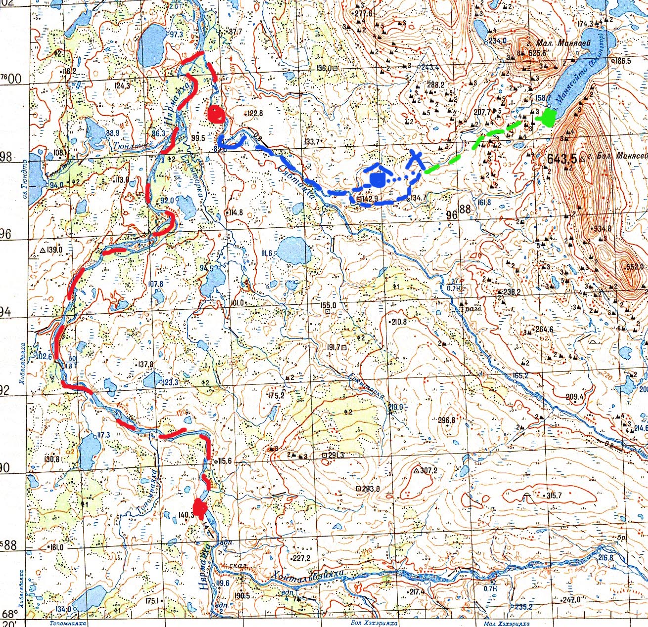 Карту сделал сразу за 3 дня. 20 августа сплавились вниз и вернулись на основную нитку маршрута. 2 дня подъёма вверх и всего 4-5 часов сплава вниз. Встретили опять москвичей, их группа с гор пока не вернулась, стоят ждут. Погода наладилась, гусей повылазило как на птицеферме. Пытался догнать тех, что еще не летают, но они хорошо ныряют и прячутся в кустах. Бегают быстро. Вошли в Сябта-яху. Ручей шириной не более 10 метров, мелкий, приходится протаскивать сквозь скрип днища о камни. На ночлег стали в окружении разбрёдшегося оленьего стада. Снимки есть, но все размытые, фотовспышку отключили для экономии, соответственно выдержка фотоаппарата в сумерках увеличилась, с рук снимать тяжело. Ночью опять лил дождь. Красный цвет -20 Синий -21 Зеленый -22 -------------------- Настоящему индейцу завсегда везде ништяк!