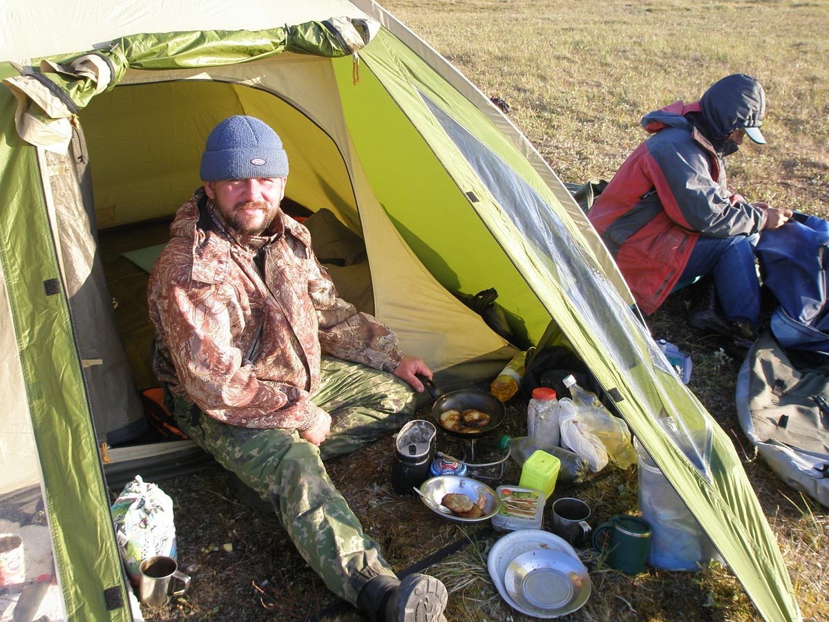 Мы не стали смущать гостеприимных хозяев, поэтому ночевали в своих палатках. Ночью был швальный ветер и дождь, пришлось мне вылезать и ставить штормовые оттяжки. Палатка ходила ходуном, но не поломало и не порвало. Утром когда проснулись, то узнали, что в стойбище вообще нет мужчин, олени ночью разбрелись и их опять все собирают. Ближе к обеду появились и мужчины, пригнали стадо. Мы собрали свои вещи и погрузили их на упряжку, сами отправились пешком. Из 3 литров спирта которые я брал, последний литр ушел в качестве награды за помощь. Дальше был сухой закон))) На озере пока ждали наступил вечер, промокли, замерзли, пошли обратно, увидели едущий караван, опять вернулись на озеро. Ветрище.... Скрылись за бугром поужинали и дождь загнал нас спать. -------------------- Настоящему индейцу завсегда везде ништяк!