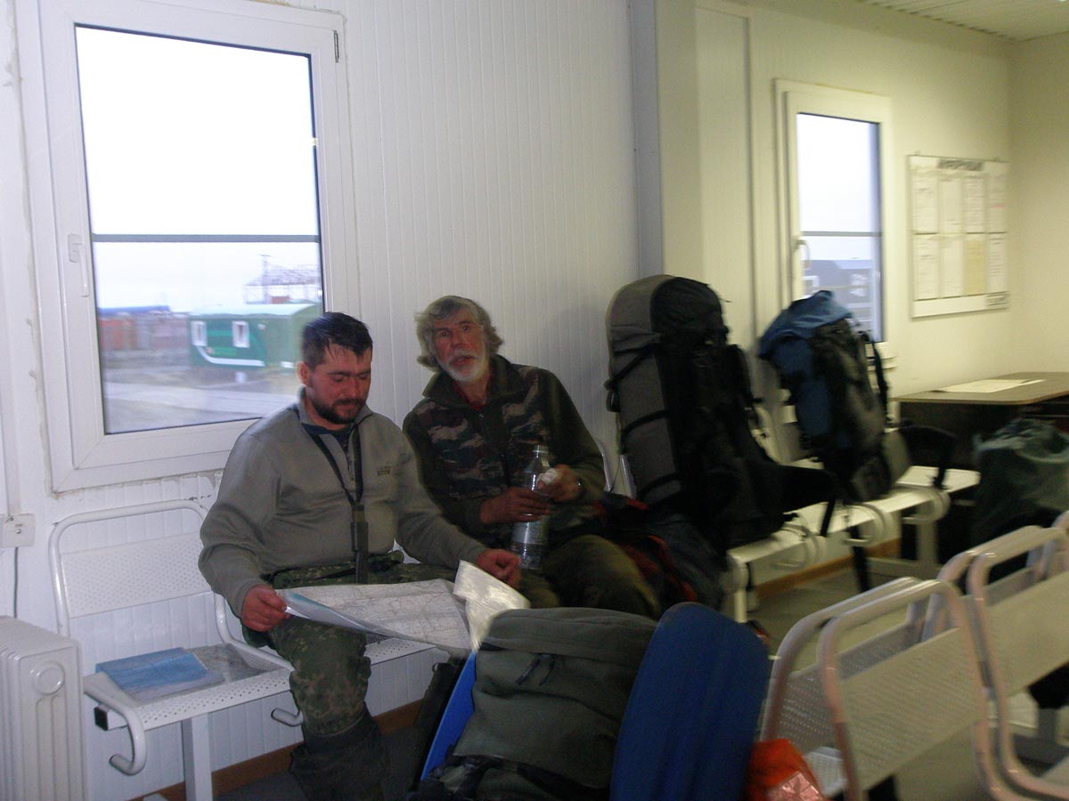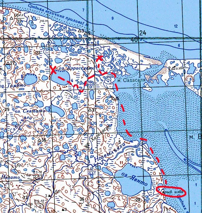 Вышли в 11 часов, ветер встречный, волна. Уже видно мачты КНС Ярынской и корабли, которые ходят где-то в проливе за островом Левдиев. Подошли к губе у мыса Сандаля. Остановились на обед. Отсюда позвонили в Воркуту (забросчику Солдаткину) по спутниковому телефону и сказали, что мы на подходе, но когда будем на Ярынской не знаем, т.к. еще не выбрали как пойдем, по морю до пролива между Левдиевым иди по заливу через озера. По заливу визуально было ближе. Договорились о контрольной связи в 7 утра. Припозднились, пошел отлив, я заторопился и успел проскочить в залив до того как упала вода. Коля с Таней нет. Вернулся к ним пешком по берегу взял баллон газа, решил идти сегодня до конца. Они остались ночевать там где обедали. Сказал, когда будут звонить Солдаткину в 7 утра пусть закажут бутылочку пива. Стемнело раньше, чем я успел дойти до конца. Ручей который нарисован на карте до озера не идет, а кончается в болоте. Пришлось 500 метров волочиться по болоту волоком. Потом по озеру, на огни строений Газпрома. Приплыл, а там кругом болото, палатку поставить негде, пошел на огни. Вышел на площадку огороженную забором и колючей проволокой, рядом проходит автомобильная дорога. Зашел на территорию, никого нет. Встретил мужика, говорит все уехали на "обед" (ночная смена). Воды тут нет и мне тут лучше не шляться. В общем ушел ни с чем. Под забором поставил палатку и лёг спать. Лег голодный и мокрый, ночью замерз как цуцик. Хотел позвонить Солдаткину, чтобы предупредить Колю, который будет звонить в 7 утра, что ручей до конца не идет и нужно идти напрямую, но мобила от холода села, номер его нигде не записал, он был вбит еще в спутниковом у Коли. Думал только об одном проснуться раньше и попросить у кого нибудь из рабочих телефон, чтобы предупредить Колю, он ведь в 7 утра будет на связи. За день прошел 23,2 км 1 сентября Утром проспал. в 9 утра разбудили охранники Газпрома и сказали чтобы я убирался куда хотел но подальше от их забора. Собрал вещи и вынес на дорогу. Спросил у работяг телефон, позвонил Алёне, просил найти в интернете Солдаткина, чтобы предупредил Колю и Таню. Съездил в магазин и сидел ждал на дороге, связи нет, трындец. Ждал что они пойдут тем же путем что и я. Прикинул, что должны появиться в районе 16 часов. Прождал до 17. Подумал, что наверное он влез в этот ручей, увидел, что дальше он не идет и повернул назад. Ночевать мне негде, от забора прогнали. Поехал в поселок, сказали вечером после 21 часа будет вахтовка в Воркуту. Позвонил Алене, предупредил если будет звонить Коля, то я уехал. В общем сидел и ждал вахтовку, тут бац! Заходят Коля с Таней, ищут меня. В общем они догадались не лезть в ручей и выйти на прямую. Но пива сказали тебе не будет. Я говорю почему? В общем еще вчера когда разминулись они пытались дозвониться Солдаткину, он трубки не брал, не взял и в 7 утра и в 10, оставили ему сообщение чтобы вышел на связь в 17 часов, но он и в 17 не вышел. В общем кинул нас по полной, хотя мы деньги уплатили вперед. В 21.30 нас посадили на Вахтовку добрые люди и мы уехали в Воркуту. От туда были попытки связаться с этим редиской, но он отвечал только на звонки с новых телефонов, гнал какую-то охинею, что в 5 утра уже нас ждал на Ярынской до часу дня. В общем врал. На предложение приехать и разобраться, отключил телефон. Было желание опустить этого козла и посудиться, но это гемор и расходы летать 