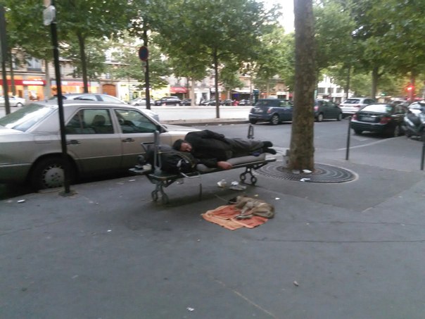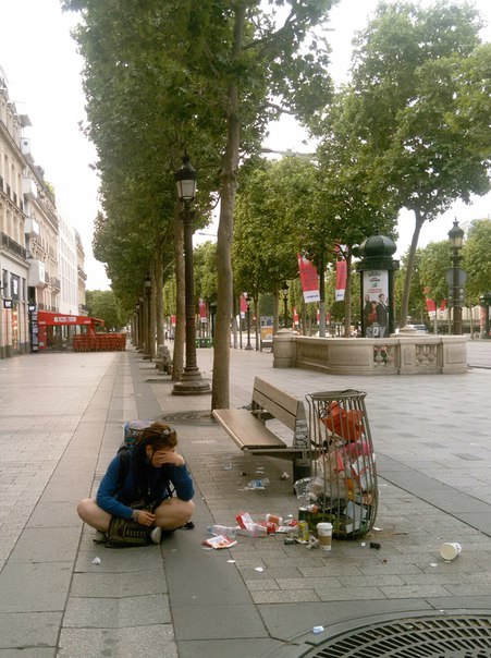 В Париж автобус нас привёз совсем в неприличное время. Я даже в интернете на всякий случай проверила. Дада, у французов тоже значилось 5 утра воскресенья. Почесали мы с Татьяной головы и решили совершить утренний моцион. А что с рюкзаками нелегкими, так даже и полезнее. Перед нами вставала Триумфальная арка, Елисейские поля, на которых в столь ранний час были закрыты все магазины и только горы мусора шевелил ветер, вместо музыки был храп бомжей и веяло на нас сильными ароматами мочи. Да иной раз загулявшие модные клубные перцы радовали слух кортавой французской речью! После нескольких дней в Париже, я начинаю подозревать, что теперь мне будет не хватать обилия мусора! Брожу я по улочками и все жду, когда же мне на голову кто-нибудь помои выльет, как в некогда любимых книжках про средневековую столицу Франции? В Париже у нас было договорено насчёт двух вписок: сутки у одного чувака, два дня следующих - у другого. Так вот, второй товарищ судя по переписке - заечка и душечка, а первый вызывал сомнения. Как-то неоднозначно и непонятно себя проявлял в он-лайн общение. Как мы ошибались! Самой за себя стыдно! Зак оказался настолько неимоверно потрясающим, насколько вообще может быть! С чувством юмора как я люблю, с интересными историями и блаблабла, много слов я могу тут подобрать. Он взялся под руководством Тани учить русский и порой почти не забывал фразу "Дай мне зажигалку, пожалуйста!". Закинув после утренней полезной прогулочки к нему вещи, решили взять велики, так он нас до ближайшей стоянки довез. А дальше был воскресный Париж! С почти ни фига не работающими в этот день продуктовыми магазинами, кучами туристов и Монмартром! В прошлом году я позабыла о существовании этого места, поэтому оно значилось пунктом 1! Высоченный холм с чудесным видом! И, не забуду упомянуть, кучами мусора) мы там перекусили сыра с багетом(вместе) и вином(пришлось за двоих отдуваться, Таня таки не пьет), часок прикорнули в тенечке под деревом. И отправились нахаживать километры по парижским улочкам. А милый Зак встречал нас вечером у метро, протягивая джойнт. То что надо, после активно проведённого дня! Ну не душечка ли? Утром в квартире стояла тишина. Мы, как примерные гости, решили не наводить шум и поваляться ещё, пусть выспится товарищ. А через пару минут услышали хлопок входной двери, прошло ещё совсем немного времени и Зак появился в дверях комнаты, приглашая нас на завтрак. Ну представляете ж себе? Встал, сбегал в магазин, приготовил, красиво сервировал стол! И! Этот милаш понимающе отнесся, когда я сказала, что не ем большую часть сделанного завтрака! Притащил мне йогурт из холодильника. А ещё он пишет чего-то там для линукса. Преподом его бывшего препода был сам Столлман! Ну вы поняли, опять ода потрясающему человеку) )) но так хочется поделиться впечатлениями! Он нас ещё и выгулял в необычный парк, где был огромный ангар в виде сферы для киноиндустрии и полянка с инталяцией частей велосипедов. И обещался наведаться в Россию, основную необходимую фразу для посещения нашей страны он знает, а на всякий случай, если забудет, Таня ему на бумажке написала) |