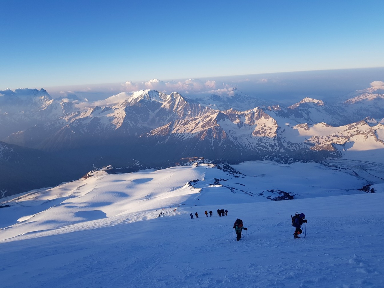 И только немного завидуешь тем, Другим, у которых вершина ещё впереди" Часть 3 Восхождение🏔 В приюте мы выжидали погоду. И вот в один прекрасный вечер, Алексей сказал, что подъем в 23-30, завтракаем и идём на вершину. Небо было ясное и была надежда, что все пойдёт как мы задумали. Спать надо было лечь в 17. Эта была главная задача, отдохнуть перед восхождением. Скажу так, на 4100м. ночью не получается нормально поспать, а тут днём надо уснуть. Я выпила снотворное, но уснула только на час! После, просто лежала. Рюкзаки были собраны, оставалась только собрать себя и налить в термос чая. И вот в 0-40 мы, включив фонарики поползли вверх по склону, навстречу вершине. Каждые 200 метров мы отдыхали и вот к рассвету мы добрались до верхних скал Пастухова 4800м. Рассвет на горе-одно из самых красивых мгновений восхождения. Ты идёшь долгое время в темноте, освещая фонариком маленький участок снега под ногами, а потом раз и понимаешь, что фонарик уже не нужен. Поднимаешь голову и видишь это🌄..... Застываешь на месте и стараешься запомнить каждую мелочь этой огромной, прекрасной картины! И все это прямо сейчас по-настоящему. Чем выше поднимаемся, тем маштабнее виды. Ощущение свободы и вневременности. Главный Кавказкий Хребет поражает своим величием и количеством вершин. Одна Ушба чего стоит 🖤🏔 Потом была косая полка, длинная и утомительная. На седловине (5300м) отдыхаем и переводим дыхание перед сложным участком. Там же дождались Славика 😁. Пьём чай, перекусываем. Впереди нас ждал достаточно крутой подъем до предвершинного плато, а потом 72 метра до самой вершины. Для меня самыми сложными были эти 72 метра 😃 ноги уже отказывались идти сами. Все восходители напоминают зомби. Ты идёшь, падаешь, потом встаёшь и снова идёшь, идёшь... В 11-30 мы на западной вершине Эльбруса 🏔 Высота 5642 метров. Крепкие объятия, смех, улыбки, радостные крики заставляют забыть про усталость. Это было великолепно и незабываемо. Просто кайфуешь от всего вокруг🖤🏔Сложно это понять, но обязательно надо испытать! Спасибо всей нашей команде. Спасибо Эльбрусу, что позволил подняться и все это пережить❤ -------------------- |