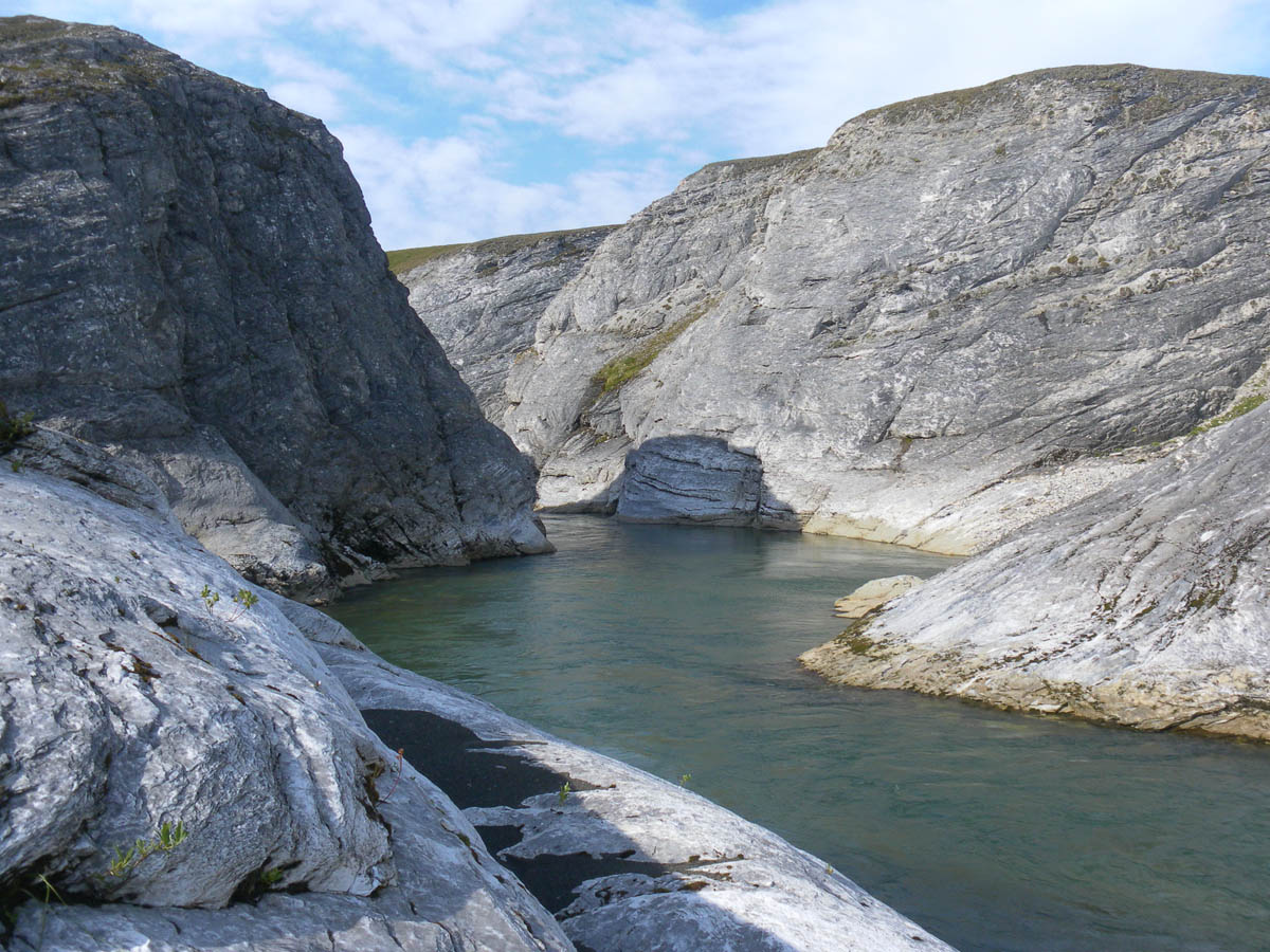 С утра совершили пешую прогулку вверх. Прекрасный вид, отвесные скалы до 50-70 метров. Как будем проходить, одному богу известно. Отправили Таню по берегу, снять с высоты. Сами полезли в эту "щель". Мало того, что сильное течение, еще и встречный ветер. Скалы отвесные, некоторые с отрицательным уклоном. Глубоко, не вылезти и не угрести. Коля справлялся с ветром и все же грёб. У меня ширина баллонов больше, соответственно парусность офигенная. Передвигался комбинируя плавание и скалолазание. Уцепился руками за правый (по направлению течения, а для меня левый" берег и полз как скалолаз по стенке, а ноги в лодке. В общем прошли 7,6 км до конца каньона. Сил затратили немеряно. На одном из порогов Барсик попал в бочку и его перевернуло, хорошо все было увязано и в гермомешках, потерял только накомарник. Но во время, которое Коля планировал на обнос мы вложились. За 2 дня нижний каньон был пройден! -------------------- Настоящему индейцу завсегда везде ништяк!