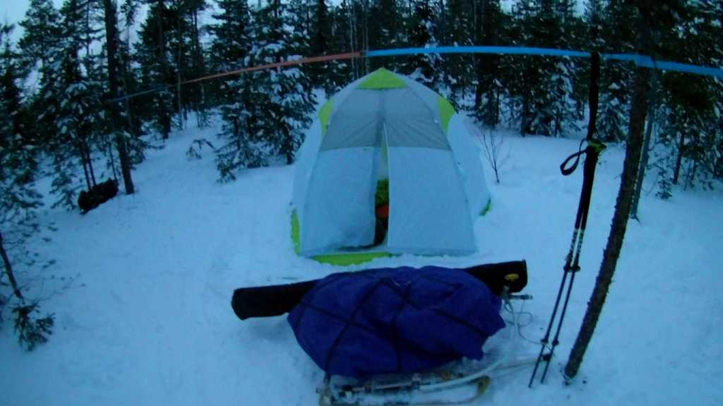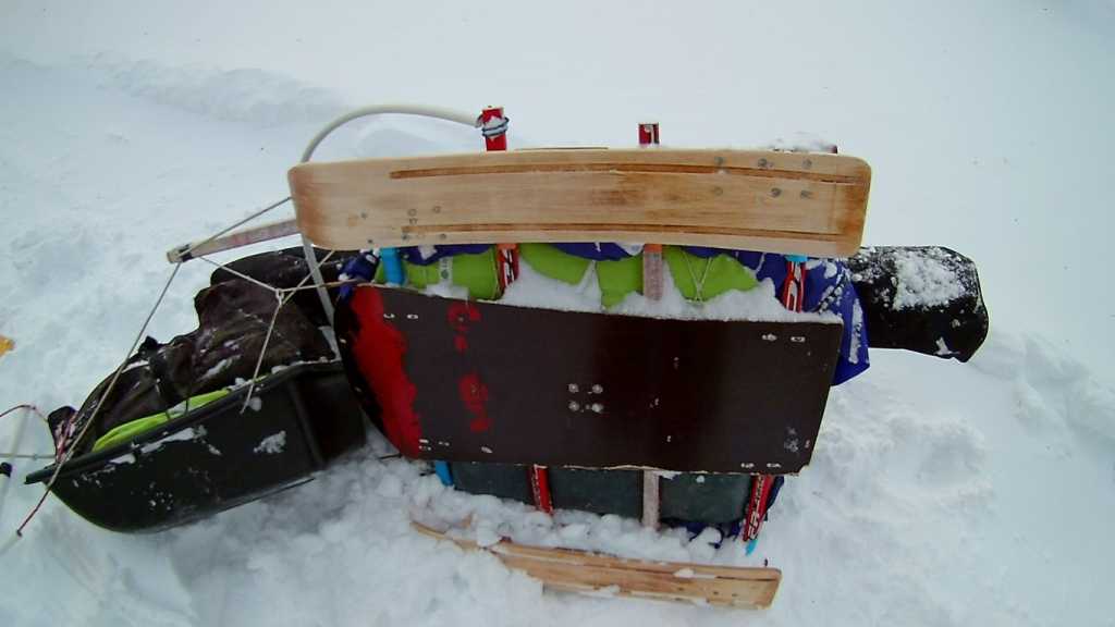 Вышел когда на улице пуржила метель. Снега навалило еле-еле ноги переставлял, все мысли о парусе быстро развеялись. С полным грузом по свежему снегу сани вообще не скользили. Вес с санями - 43кг, и + 12 кг кайты в коробе, всего 55; Если учесть лыжи и трапецию, то еще +10 кг, итого весь багаж около 65-70 кг. Из положительных наблюдений: динамическая нагрузка в 50 кг на такую конструкцию вполне рабочая; сочленение из двух деталей хорошо показало себя на ямах и буграх, а также в режиме челночного передвижения; днище пригодилось на торосистом участке. Что хотелось бы изменить: увеличить степень скольжения на мягком снегу. Следующая вариация - длинная узкая низкая площадка с поворотным передком. -------------------- После нас сегодня чище, чем вчера. Тело должно двигать себя само.