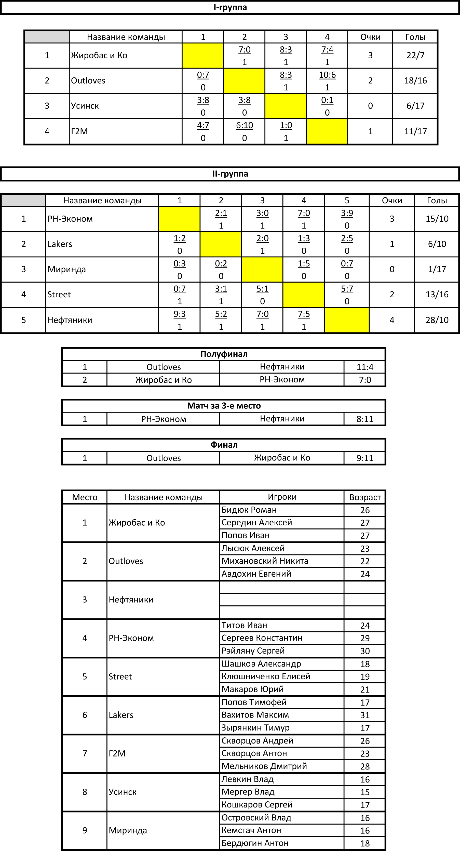 за первое место играли "РВП" и "3 Амиго". игру прервали из-за травмы игрока "РВП". счет в это время был 10-8 в пользу "3 Амиго", играли до 11. делаем выводы. и еще, в баскетболе к примеру если команда по какой либо причине не может продолжить игру (не хватка игрока к этому относится) победа присуждается команде сопернику. вот -------------------- как-то так...