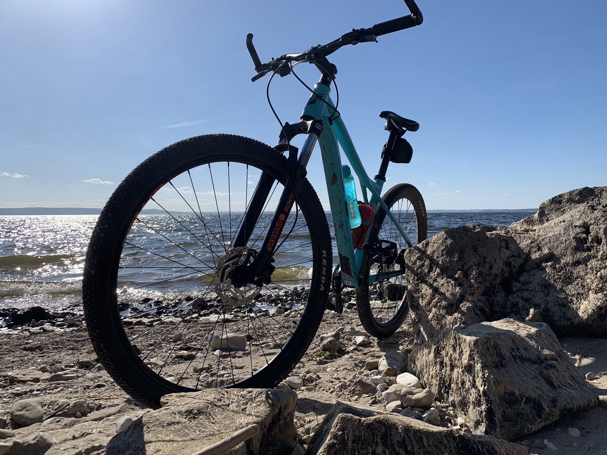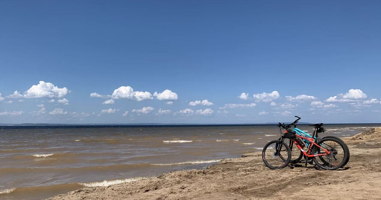 До места на машине, а по побережью на велике.