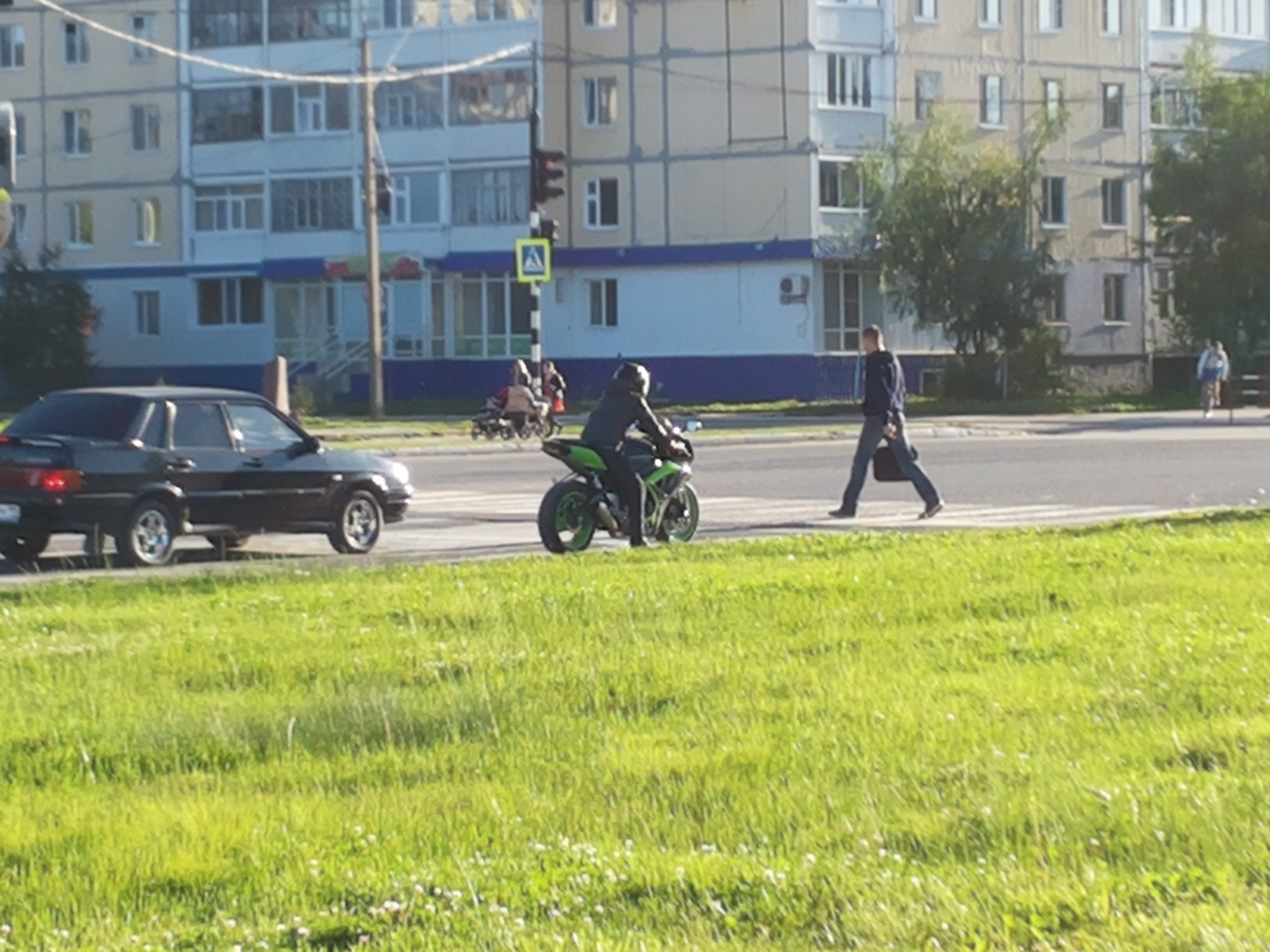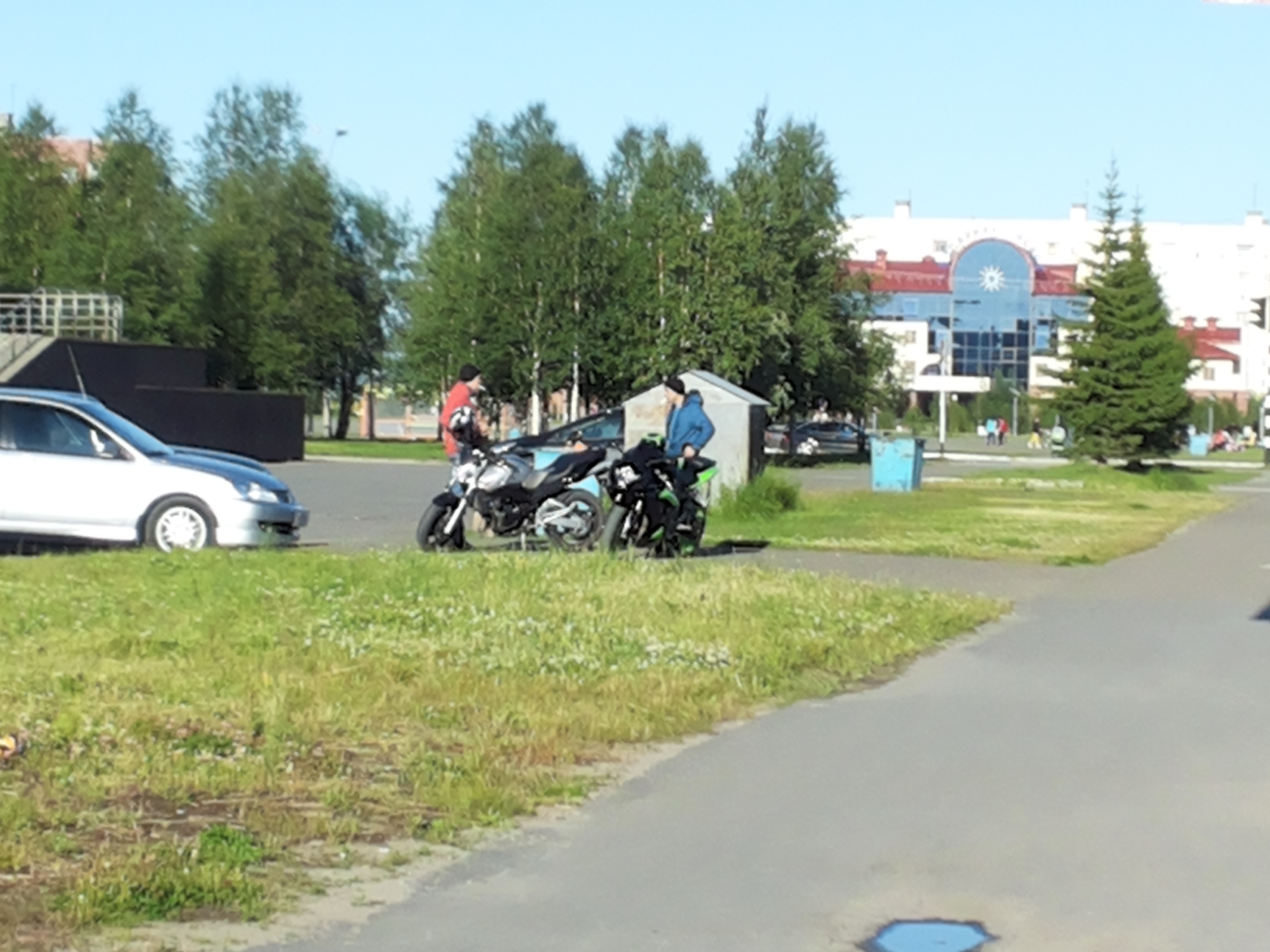 А еще эти два товарища шумные очень, дитю моему спать мешают и меня пугают(((( Я вот удивлялась: зачем они по городу наматывают круги, а потом допёрло, что в лесу ими восхищаться некому будет... А этот - на черном мото (возле института), вообще, не видит стоп_линию (все видят, а он нет(((( Знайте дорогие мотолюбители: что такая езда приводит к порче кармы... Это мото не для леса, они там просто не проедут, я свой "спорт" продал салатовый, но на фото его нет. Смысла не увидел кататься на таком в городе. Вот эндуро самое то в лесу грязь месить... эх поскорее бы следующее лето, новый мотоцикл |