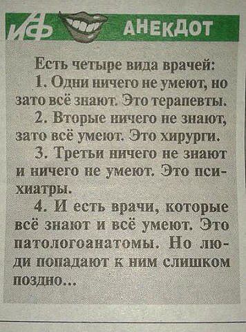 Патологоанатом: - Смотри, кругом люди! Живые люди! Гинеколог: - И лица! Лица!!! |
