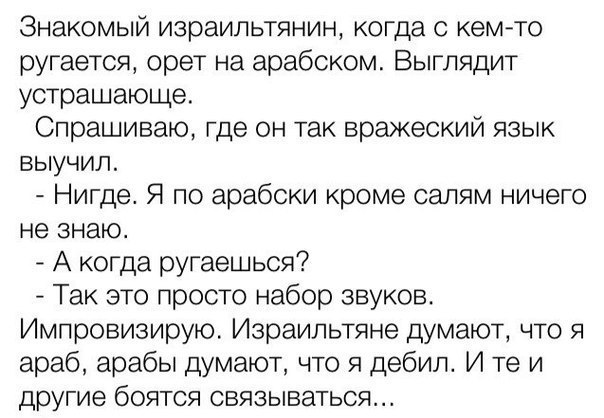 *Мы ремонтируем то,шо починил ваш муж* - Беня, ты знаешь, я - твоя будущая жена. -ойц, Софа! И как это, по принуждению или по любви? - Это как сам решишь. Захочешь - по любви, не захочешь - по принуждению. Ты совершенно свободен в своем выборе. В ресторане: - Девушка, можно пригласить вас на танец? - А вы ночью не храпите? — Ваша дочь, только что согласилась стать моей женой. — Сам виноват, нечего было ходить сюда каждый вечер! -------------------- .... Hичто так не укрепляет веру в человека, как предоплата!
