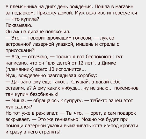 — Бабушка, а кровь вкусная? — Да откуда же мне знать, деточка? — Папа сказал, что ты ему всю кровь выпила. — Мозгов нет у твоего папы! — Конечно... . мозги ты ему еще летом съела. Сообщение отредактировал Славик - 30.7.2015, 14:57 -------------------- .... Hичто так не укрепляет веру в человека, как предоплата!
