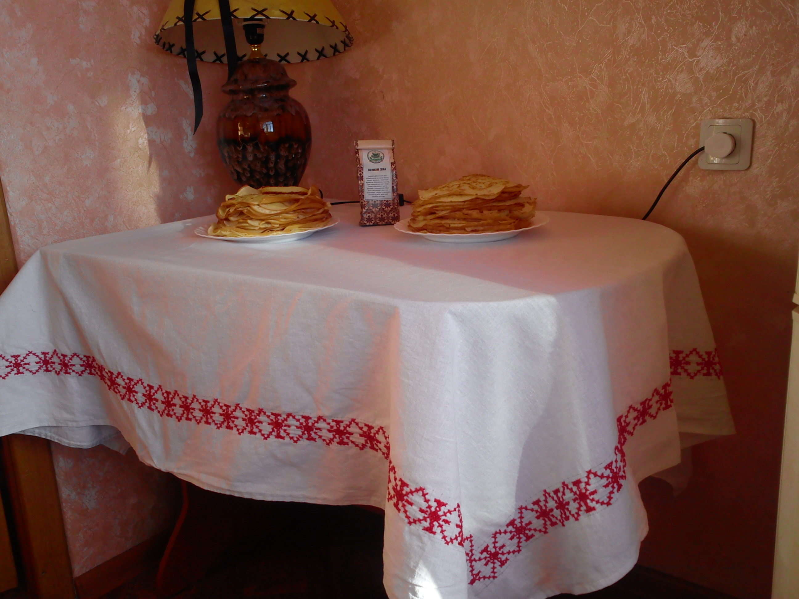 Вчера наконец завершила скатерть-самобранку свою. ))) Теперь она украшает кухню и ждёт гостей за стол. Радостно от того, что уже сегодня на ней появились чудные блины да ещё двух видов! Ну, блин я про скатерку не знал))) Молодец! А блины чудо, бегите пока есть! -------------------- Настоящему индейцу завсегда везде ништяк!