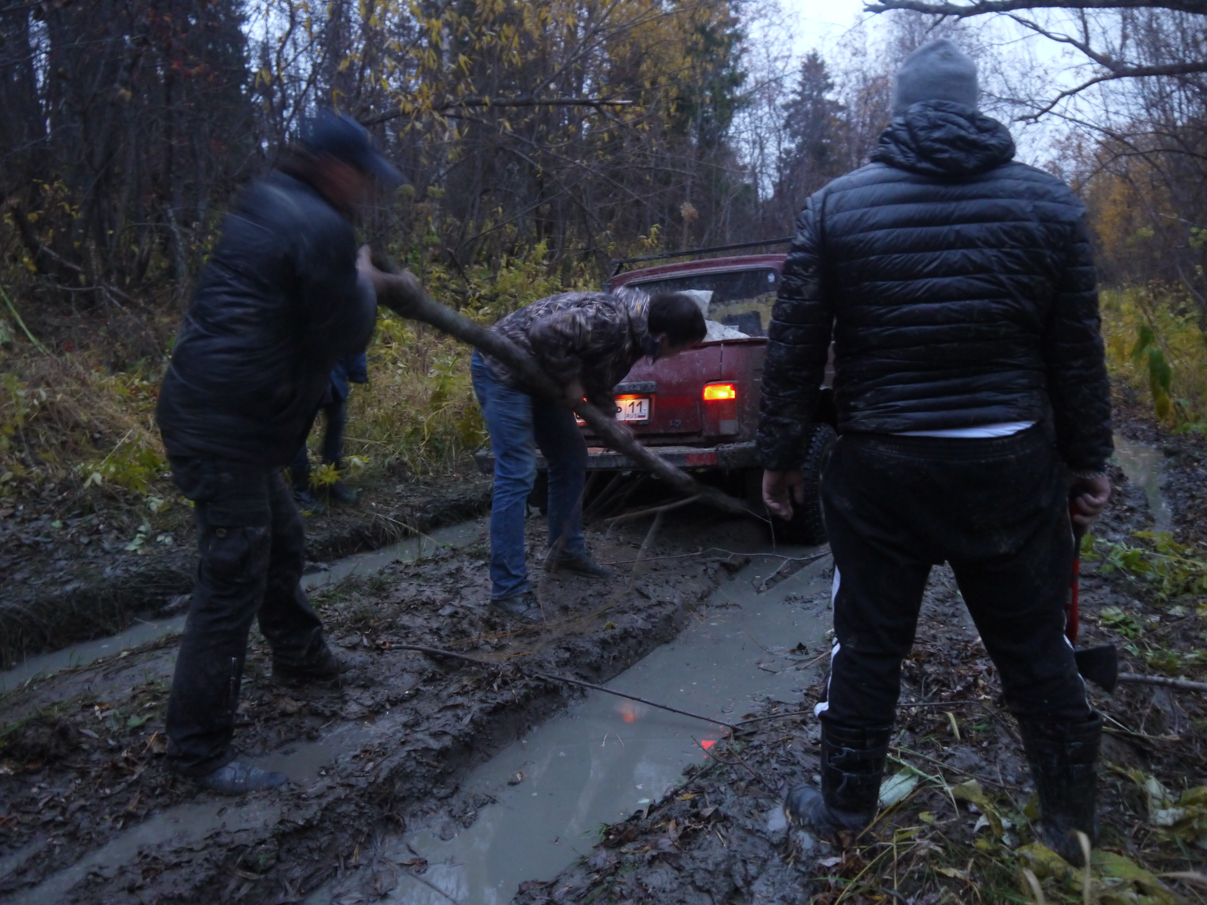 В этот раз у нас вообще была веселуха. Пробирались к озеру по болотам. насколько смогли подъехали. От машин ещё до озера примерно километр. Но на пути болотце, которое мы не рискнули без лебёдок проходить. Да и куда там, если в одном месте я провалилась по пояс, но дна так и не почувствовала, в другом месте Саня УАЗ тоже по пояс ушёл. Он то переоделся, а я все штаны на деревья развесила сушить. Так и рыбачила в колготках, куртке и броднях.