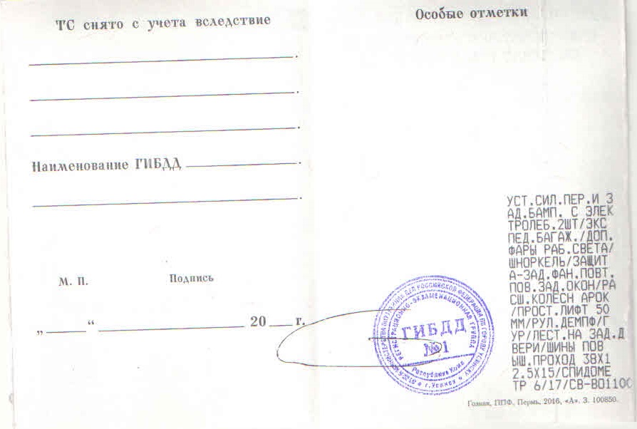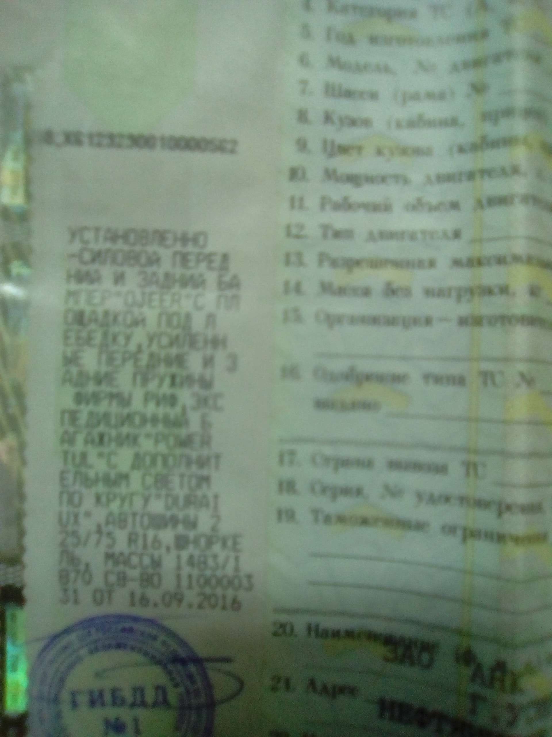 Привет! Обратились в компанию ВЕГА. Предоставили пакет документов на переоборудование ( Сертификаты, перечень проведенный работ и т.д.) Через недели две получили ответ из лаборатории о возможности применения всех узлов на данный автомобиль) Снова предоставили в ГИБДД авто переоборудованное. Документы отправили в Республиканскую ГИБДД. Через месяц пришел положительный ответ. Получил на руки разрешение Гибдд на переоборудование. Обратился в отдел регистрационного учета за внесением изменений в ПТС и Свидетельство. Снова пригнал машину на осмотр подписали не смотря. Неожиданным стало то что в Свидетельстве нет места для того чтобы указать все изменения, также в актах и сертификатах указаны фирмы производители комплектующих, но программа в ГИБДД не понимает латинские буквы. Более 1,20 мин думали как сократить слова и не потерять смысл. Совет от сотрудников теперь возить с собой ПТС там все влезло (опять же кроме фирм). Цена вопроса ВЕГА - 22000 т. 89121248393 Владимир Гос пошлины - 2000 переобор, 850 внесение изменений в доки Весь пакет есть в электронном виде кому надо сброшу!! Саня, а что лебедки не прописал? только передний и задний сил.бампер с площадкой под лебедку, а где сама лебедка? |