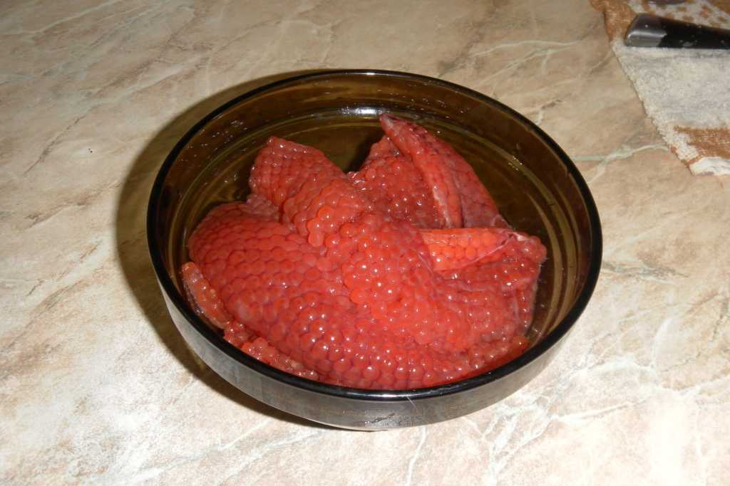 Logotip, рискнул я и попробовал метод горячей воды с разницей что шкурку прям кипятком ошпарил. Она прям сразу свернулась и чуть ли не половина икры сама отошла.