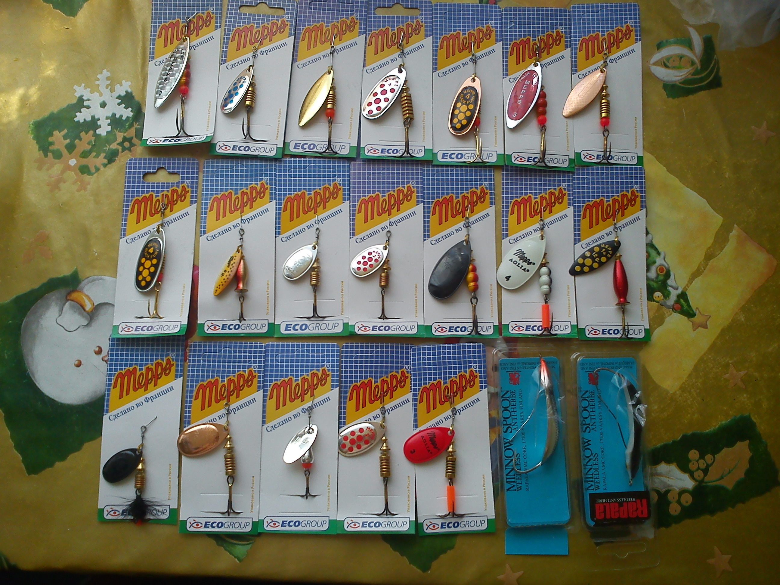 Вот пришло на днях. Будем пробовать как толька вода чище станет =) А ну да забыл купил себе еще и Mighty Bait - фотки нет, могу сделать. Хорошие блёсна, проверенные. Верхний ряд третья с лева... убийца щук размер 1+.. а вообще универсальная блесна, кроме как в ситуёвинах, когда заброс апстрим. Вверх по течению хороши блёсна Мепс - второй ряд третья с лева... харюзовый киллер.. упористая хорошая блесна... размерчик под харька 1-2. Особенно серебро. Блек фури - отлично окуня косит размер 2-3. Мепс блек фури с точками в размере 1-2 язя собирает знатно. Ну и колебло миноу спун в коряжнике вещь...только проводку подобрать... правда у меня щука её( блесну) перекусила пополам..... В общем наборчик отличный...мне очень нравится.... ![]()