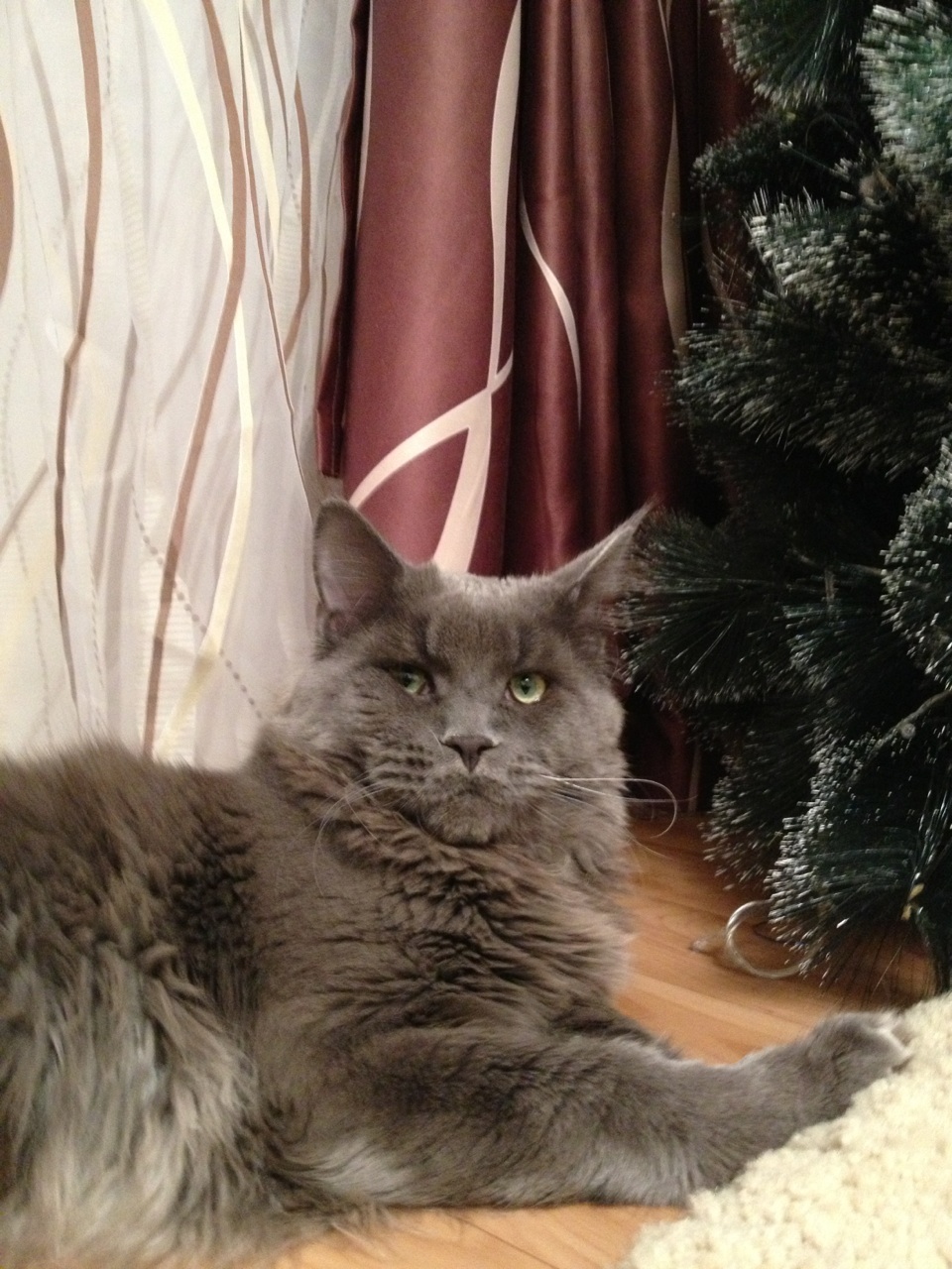 Знатный красавец! ) Только такого потискать страшно.. Да и как-то не выглядит он для тисканий. )))) С таким быстрее на охоту пойдёшь! Он очень добрый совсем не царапается дочка таскает его как хочет , начинаешь тискать лежит безропотно пока нам не надо ест его " мучать" потом только уходит , очень добрый и такой мурлыка тарахтит на всю квартиру и совсем безобидный , даже когда стрижем ногти или купаем безропотно все выносит , даже мяукает очень редко и как маленький котенок тихонько . У брата британская кошь так такая злюка погладишь ее , будешь весь поцарапанный , больше не с кем сравнивать да и по отзывам мейн-куны очень добрые и ласковые больше по характеру походи на собак чем кошек ходят по пятам за тобой где ты там и он . |