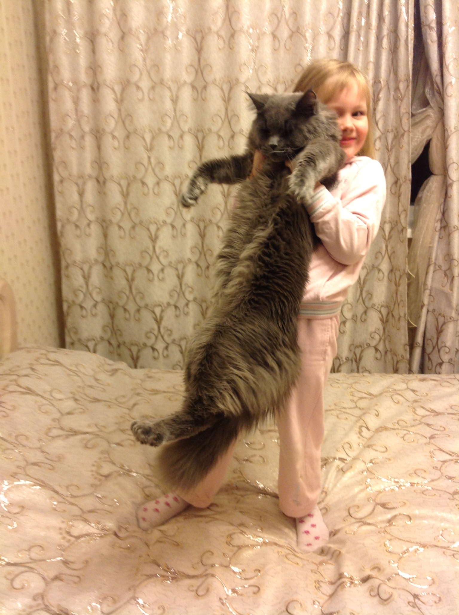 Он очень добрый совсем не царапается дочка таскает его как хочет , начинаешь тискать лежит безропотно пока нам не надо ест его " мучать" потом только уходит , очень добрый и такой мурлыка тарахтит на всю квартиру и совсем безобидный , даже когда стрижем ногти или купаем безропотно все выносит , даже мяукает очень редко и как маленький котенок тихонько . У брата британская кошь так такая злюка погладишь ее , будешь весь поцарапанный , больше не с кем сравнивать да и по отзывам мейн-куны очень добрые и ласковые больше по характеру походи на собак чем кошек ходят по пятам за тобой где ты там и он .