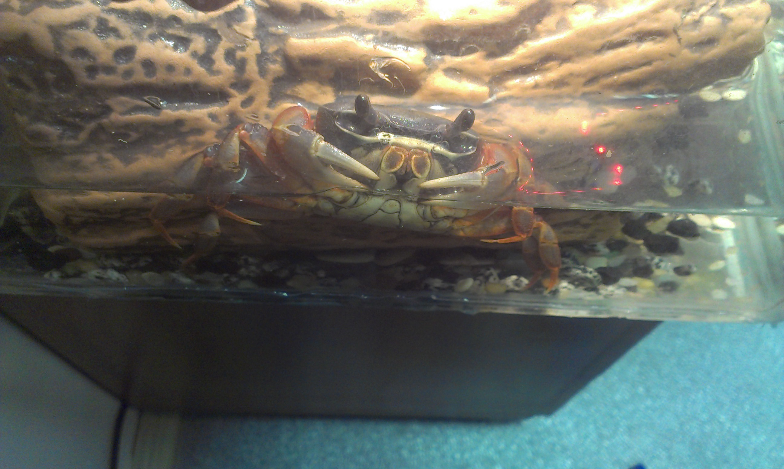 Вот сегодня удалась увидеть крабика. Установил ему лампу,чтоб теплее было. И он решил показаться. А так сидит в домике и выходит только ночью...