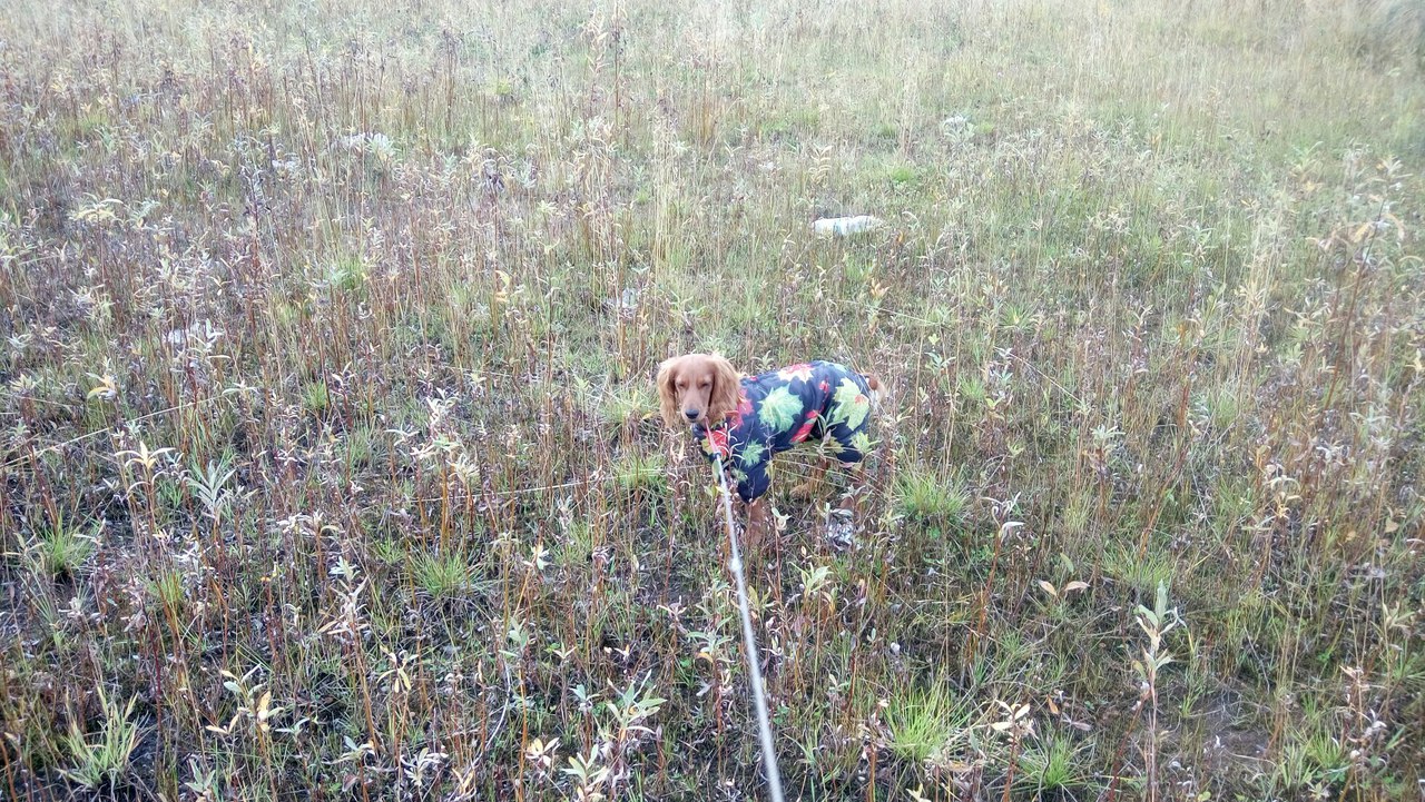 Коке-спаниель. Они и зимой без комбинезонов себя прекрасно чувствует.
