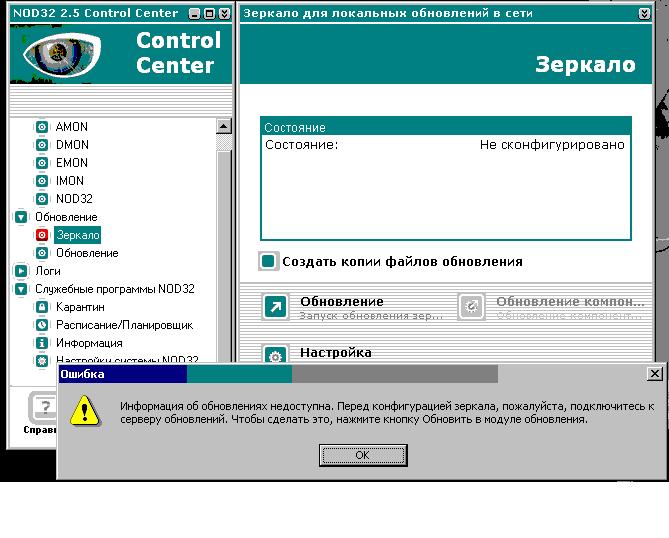 хе у меня дома пускает как у тебя сконфигурировано обновление? ты обновляешься с каких сайтов? какая у тебя версия, крякнутая триал или оригинальная? Сначала установил Антивирус и при установке выбрал настройть обновления позже, перезагрузил комп. Потом запустил из папки crack файл NOD32.FIX.v.2.1-nsane, перезагрузил комп. В выборе сервера сразу уже стоит автоматический выбор. При нажатии на кнопку обновить вирусные базы загрузились, и в меню информация появились следующие данные. Испытательная версия осталось дней: 16715855 и так далее тпро версию вирусной базы где написано что она обновлена сегодня. Может я не так , т.е. скорее всего не так установил. Но антивирь работает и обновляется. Как нужно правильно? Опиши как ты установил что у тебя пускает в настройку зеркала. |