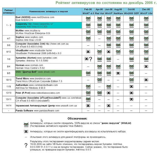 расскажу о свих критериях выбора. первый критерий частота обновления баз. сразу в треш ушли такие как маккафи. обновление баз раз в неделю это даже не вчерашний а позавчерашний день. правда ходят слухи что они год назад перешли на ежедневное но по мне это фикция не более чем маркетинговый ход. второе и немаловажное величина скачиваемых обновлений. сразу отсеялись такие как нортон. качать базы по 10 метров каждый день ну нет. третье ключи. сразу ушли такие как битдефендер етраст антивир(платный) и т.д. четвертое. наличие монитора. стразу отмел такие как антивир(бесплатный) и кламвин т.д. т.е. практически все бесплатные за малым исключением. пятое модульность. т.е. возможность отключать или не устанавливать монитор. тут отпал каспер 5й. шестое но важное. как ловит вирусы. т.е. в случае чего можно мирится с другими недостатками. сразу отмечу недостатки антивирей. лучше всех ловят нортон (корпоративный), каспер, нод, битдефендер. кламав (не путать с кламвином) т.е. лидеры они всегда лидеры етраст так и не запустил не нашел ключа. вторая очередь по качеству отлова это дрвеб панда писисилин аваст макафи. такие антивири как антивир ваще лучше не пользовать. а хваленый ф-секьюре на трех движках пропустил столько всего чтовпору за голову хвататься. но тут же было замечено несколько глюков которые понизили рейтинги. это нортон он не сканирует в рар авивах я так подозреваю что и 7зип ему тоже не по зубам и кламав у этого вообще странный глюк не сканирует рекурсивно в папках с русским названием. глюк панды в том что если она криво встала то выдрать ее из операционки очень проблематично. из лидеров оказались битдефендер каспер нод. битдефендер ушел в треш в связи с ключами. каспер ушел в треш в связи с отсутствием модульности и тормознутостью. остался нод. какие у него недостатки. их немного но они есть. все в нем супер за одним маленьким исключением. к новым троянам он равнодушен. если по поводу червей или простых вирусов у него эвристика работает на ура, то с троянами он "дружит" в помощь ему надо ставить сканер троянов и эта пара будет убивать все. и конечно у него не такой сканер как у каспера. тут он лучший. если можно лечить то ни один сканер не сравниться с каспером по поводу лечения. лечит он супер. я так и подозреваю что вычищает он получше других. это все мои опыты по прошлому году. в этом году вышел и каспер новый и нод новый кламав и другие антивири обновились. поэтому надо тестить... пысы если бы не рекурсия кламава не было бы ему равных... -------------------- На этом форуме только уважаемые лица