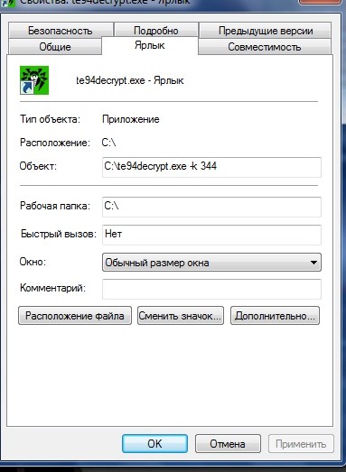 Запускать надо с ключом -k 344. Если убирали расширение .EnCiPhErEd нужно вернуть на место. Можно создать ярлык на дешифратор и в нем прописывать ключ, либо через командную строку. пример: Выполнить - D:\Downloads\te94decrypt.exe -k 344 Ну или так, через ярлык: -------------------- Нарушителями ПДД не рождаются. Ими умирают.