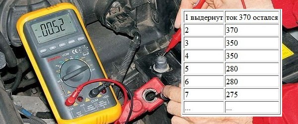 Спойлер Проверяем утечку тока в цепи автомобиля! Чтобы узнать куда девается ток и почему ваш аккумулятор разряжается значительно раньше положенного срока обычно рекомендуют измерить ток утечки и «выловить» ветвь схемы, где он «убегает». Простые рекомендации типа «подключи АКБ через амперметр» «почему-то» терпят неудачу — амперметр или ничего не показывает, или показывает белиберду, несовместимую со здравым смыслом. Так вот, всё по порядку. • Работу лучше выполнять ВДВОЁМ. • Отключить все явные потребители энергии типа дальнего света, габариток, магнитолы и т.п. • Отключить неявные потребители энергии типа подкапотной лампы, освещения багажника и т.п. Даже автономная сирена или встроенный сотовый телефон могут пожирать немалый ток (сотовый «по дефолту» включен ещё 2 часа после выключения зажигания). На сложных авто, напичканных электроникой, должно пройти не менее 5 минут — производители часто некоторые приборы поддерживают в «активном» состоянии в течении 3-4 минут после выключения зажигания. • Отключить сигналку или поставить её в режим «VALET». Ток покоя нормальной сигналки — 5-10 ма + примерно 5 ма на каждый мигающий светодиод или 10 ма на каждый постоянно горящий. • Подготовить шунт (кусок провода с качественными зажимами, лучше типа «крокодил») • Аккуратно соединить шунтом клемму АКБ и ответную клемму провода, идущего в недра авто. icon cool Проверяем утечку тока в цепи автомобиля • Снять зашунтированную клемму с АКБ (цепь не должна прерваться, ток разряда должен течь по шунту). • Амперметр поставить на самый «грубый» режим измерения тока. Малоинтеллектуальный цифровой мультиметр — аналогично. Высокоинтеллектуальный с режимом выбора диапазона — ничего не поделаешь, просто подключить в режиме измерения тока. • Амперметр подсоединить параллельно шунту, соединив клемму АКБ с ответной клеммой, которая к АКБ присоединялась. • Отсоединить шунт и зафиксировать показания амперметра или мультиметра. Должно быть мало, в районе «0″. • Если тестер/амперметр/мультиметр с ручным выбором диапазона, то: - вновь подключить шунт - поменять диапазон на более чувствительный - отсоединить шунт - сделать замер Если мультиметр с автоматическим выбором диапазона, то делать ничего не надо. • Предположим, что в результате мы «намеряли» «базовый» ток внешней утечки 370 ма. • Теперь один человек смотрит на мультиметр и «снимает показания», а другой идёт к блоку реле и предохранителей и начинает «выдёргивать» предохранители по порядку один за другим. Другой после крика «первый — нету!» записывает изменившиеся показания. Потом — после крика «второй — нету!» … 8-)) Получается таблица типа (таблица на 2ом фото) Расшифровка таблицы: В цепях, защищённых предохранителями № 1,2,4 и 6 заметных утечек НЕТ. В цепи, защищённой 3-м предохранителем, утечка 20 миллиампер, 5-м предохранителем — 70 миллиампер, 7-м предохранителем — 5 миллиампер и так далее. Как искать дальше — отдельный разговор. Хорошо, если после «выдирания» последнего предохранителя остаточный ток утечки не превышает 10 ма, иначе надо будет разбираться со стартёром и с генератором, а если машина со сложной электроникой — ещё и с блоком АБС, AirBag, Мотроником и тому подобным. Напомню, что большинство электронных приборов автомобиля запитаны напрямую от «+» без каких бы то ни было коммутаций, а «включаютс