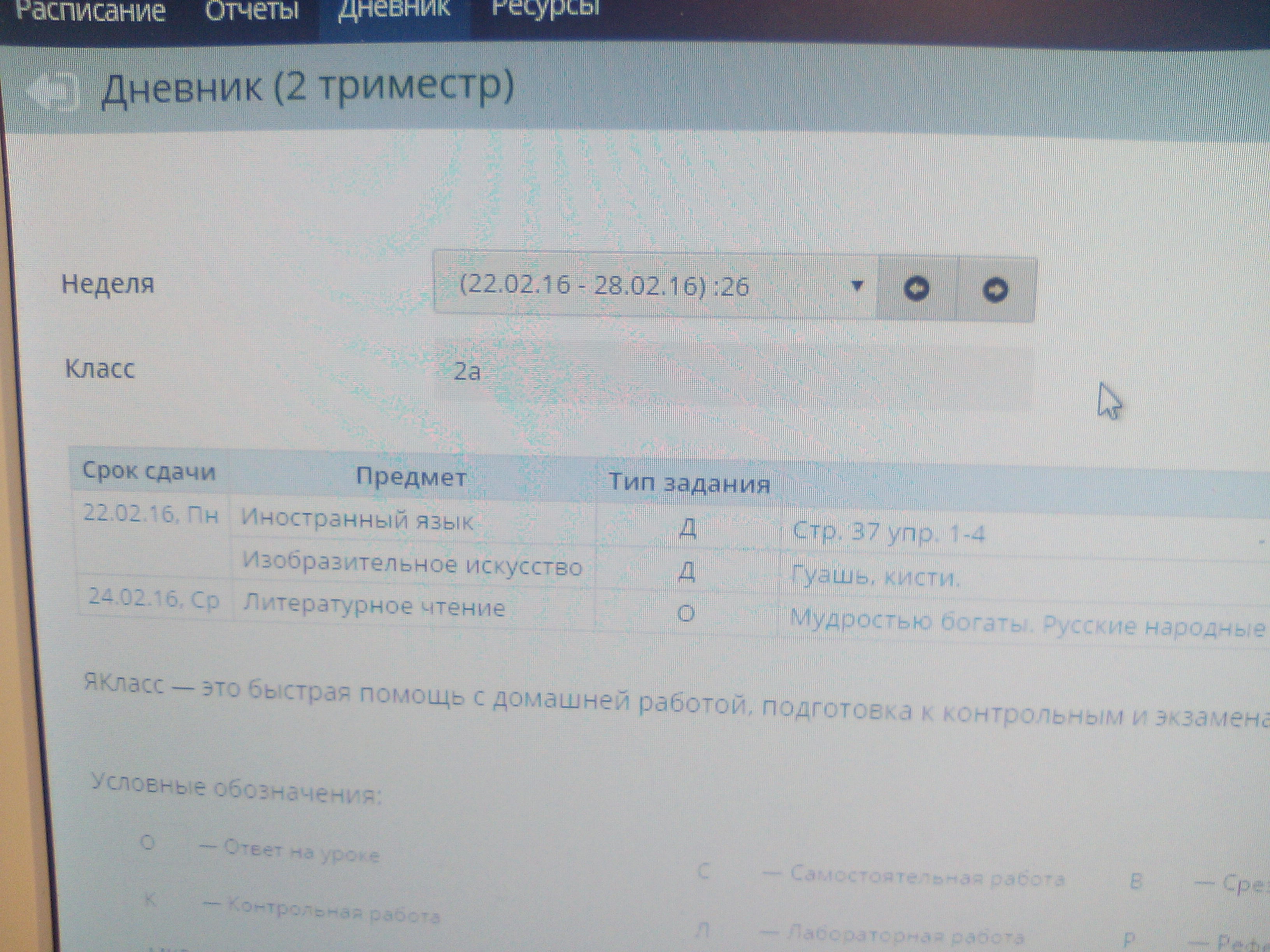 Что касается электронного дневника. Завтра вот 25 февраля. Домашнее задание есть только на 24 февраля. И то не все. Что делать? Конечно же ребёнок записал ДЗ в бумажный дневник. А если нет...то выходит и ДЗ нет на завтра. Ц Так и подними этот вопрос в школе. Для начала задай кл.руку. У нас не у всех учителей есть интернет онлайн(или ноутов у них нет , или еще чего, не знаю, в общем).Они отдают все сведения классной и та до 15:00 все заносит в эл.дневник. -------------------- Если девушка купила "Бентли", это не значит, что у неё богатый любовник. Может она два месяца копила...