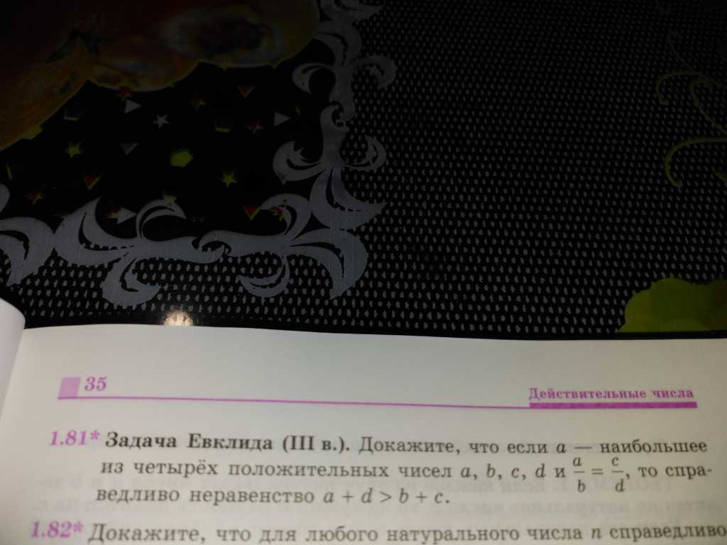 Интересная задачка Евклида, учебник 10-го класса, задача со звёздочкой : Докажите, что если а - наибольшее из четырёх положительных чисел а,в,с и d, и a/b=c/d , то справедливо неравенство a+d>c+b.