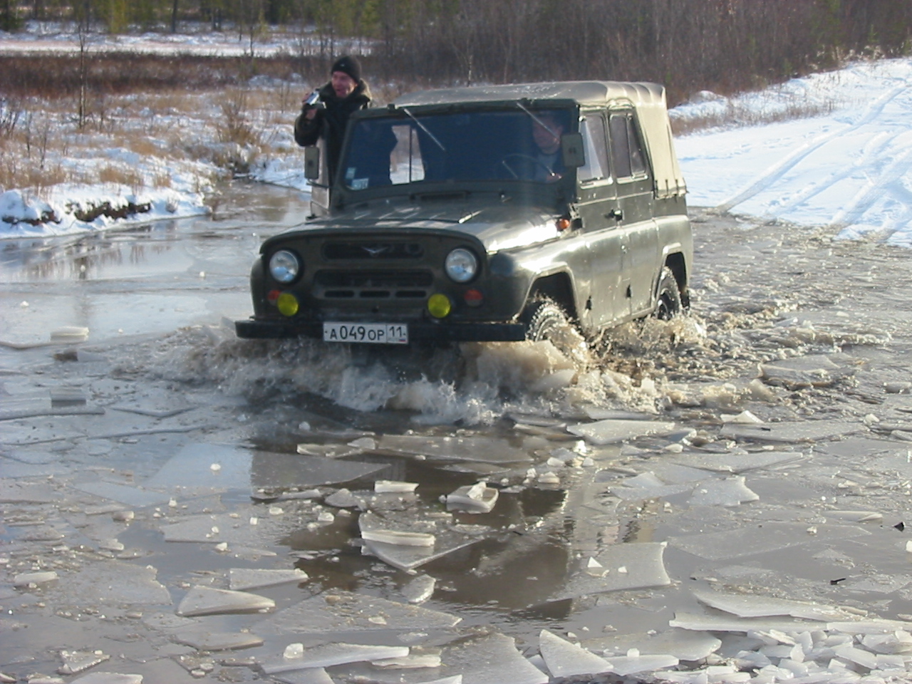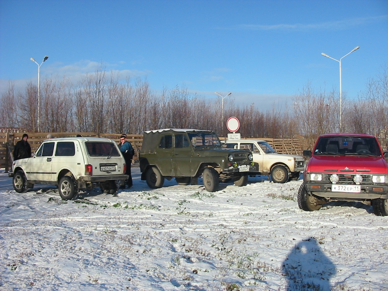 --------------------------------------------- Внедорожные покатушки, Хроника одного приключения. Утро. Трель телефонного звонка выводит из заторможенного состояния сна. - Я. Да. Уже собираюсь. Через 15 минут буду. Мельком бросаю взгляд на часы и понимаю что уже катастрофически опаздываю. Вскакиваю с кровати и бегу в ванную, набирая по пути номера телефонов. – Аллё! Спишь что ли? Ты едешь? Давай собирайся сейчас заеду. Следующий абонент отказался брать трубку. К тому времени я уже был полностью экипирован. Сапоги, штаны комбинезон и сложенная в пакет куртка спецодежды. Так я подготовился к событию которого ждал уже неделю. Сегодня мы с группой энтузиастов должны были покорить себе бездорожье. Улица встретила меня яркими лучами солнца и лёгким морозцем, который за ночь покрыл всю мою машину инеем. Правда всё же кое где просвечивали пятна грязи, но это не портило общего впечатления морозного клубка. Пока машина прогревалась, я с помощью скребка уничтожил плоды трудовой деятельности морозца на своем танке. Через несколько минут я уже выезжал со стоянки по направлению к дому Лёхи, идейного и технического вдохновителя нашей небольшой авантюры. Забрав Леху, а вместе с ним и небольшое количество шанцевого инструмента, дабы не оказаться безоружным перед лицом грозной действительности, мы заехали за Деном, и неспеша направились к месту общего сбора на автовокзале. Там естественно никого ещё не было, и мы вдвоём с Лёхой отправились на “заработки”, сбивать необходимую сумму для заправки нашего гостеприимного танчика. Пока мы правдами и неправдами добыли деньги, к месту сбора прикатил Колян на служебной “ниве”. Для незнающих поясню Колян относить к тому роду людей которые могут загубить самое смелое начинание в корне, если им дать на это волю. Он стал стращать нас что дороги там нет, что мы пропадём без вести и вообще лучше сидеть дома перед телевизором и бухать водку. На что мы ему ответили, что нам без разницы, есть там дорога или нет, и что если её там нет, то мы её там сделаем. Чтобы не терять зря времени я оставил народ дожидаться остальных, а сам поехал на заправку. На заправке несмотря на ранний час оказалась довольно большая очередь. Все видимо решили провести выходной день на природе, но благодаря заторможенной реакции водителей, которые почему-то подъезжают только к ближним колонкам, напрочь игнорируя более дальние. Вобщем используя этот баг в настройках усинских водителей, я умудрился пролезть мимо всей очереди к пустующей дальней колонке. И уже через несколько минут, на всех парах сматывался оттуда заправленный и провожаемый изумлёнными взглядами водителей. При подъезде к месту сбора, обнаружил кроме Коляновской нивы существенную прибавку, Ниссан и Уазик. Водители и штурманы стояли рядом оживлённо переговариваясь с моими пассажирами. Приветствия, ожидание, телефонные звонки. На это было убито ещё около получаса и вот все решились. СТАРТ! Путешествие началось! Ниссан пообещал догнать нас по дороге. А мы потихоньку выдвинулись в сторону Пармы. Конечно колона из одной нивы и уазика не могла похвастать тем что являла собой прямо таки захватывающее зрелище, но настроение было на подъеме, солнце радовало своими лучами и общее настроение экипажа было преотличнейшим! Дорога покрытая тонкой корочкой льда и летняя резина, своим дуэтом сдерживали желание у