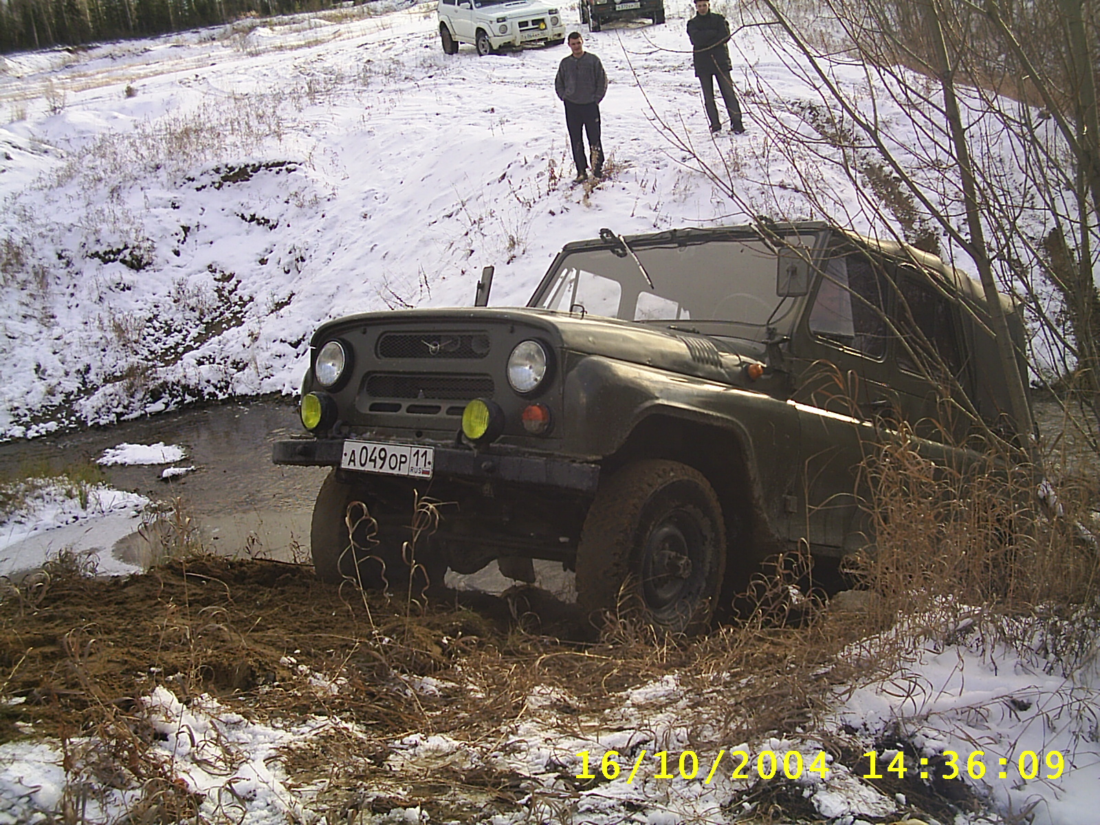 --------------------------------------- Внедорожные покатушки 2004 Вот и состоялись первые в истории нашего сайта внедорожные покатушки. 16 октября 2004г. Маршрут: Усинск - Колва по асфальту, далее по старой грунтовке до Головных Сооружений и в Усинск по асфальту. Объявление было дано за неделю до события, именно "события", потому как такого никто у нас раньше не делал. Мы были первыми. Будущие участники писали в форум, звонили по телефону, а как дело дошло до выезда, так многие оказались занятыми, поломанными и т.д. и т.п. В итоге задержали выезд на пол-часа. Собрались: 2 Нивы, УАЗ и Ниссан-Террано. Ну и то неплохо на первый раз. В общем выдвинулись. А денек надо вам признаться удался: солнце, морозец легонький (около -3), ветра нет, одним словом "Душа поет". Асфальтовые километры пролетели незаметно и вот мы у первого ручья. Здесь надо оговориться, что по причине все того же морозца мощного ОФФ-роуда не получилось (грязь замерзла) и основными препятствиями на пути были ручьи, впрочем из-за этого же морозца вода в ручьях упала. Да оно и к лучшему, потому как народ оделся кто как, кое-кто надел кроссовки. Болотники были только у меня, поэтому мне и пришлось все броды проверять. В общем, проверил я первый брод, дал добро, народ поехал. И так всю дорогу. На ручьях выходили, фотографировали, снимали на видео, снимали на ходу из машины. Вот так, не напрягаясь, прошли всю трассу. Серьезно тормознулись только в одном ручье. Моста там уже лет этак ....дцать нет, а перелом рельефа неслабый. Там и побуксовали и тросы разматывали и дергали. Сначала полезла первая нивка - не смогла, попыталась в объезд - опять села. Выталкивать в гору смысла не было. Пошел УАЗ тоже не смог: в натяг мощи не хватило, дает газу закапывается. В итоге он заехал, сколько смог, потом зацепили трос и руками вытащили наверх. Первую нивку и Террано вытащили УАЗом, а дальше было самое интересное. А дальше белая Нива в нежном (и изрядно потрепанном) пластиковом обвесе взяла да и заехала сама. Во как бывает... Потом был финиш, быстрая езда по асфальту в город, просмотр видео и бурные обсуждения. Так что начало жыперскому движению положено, теперича надыть его поддерживать и развивать. Приглашаем всех желающих вступать в наш клуб и участвовать в мероприятиях. (С) Алексей Сельницкий. ------------------------------------------------- Видеоклип Креативного Бюро по мотивам первых и вторых покатушек. -------------------- "Я люблю этот город, но зима здесь слишком длинна" (С)