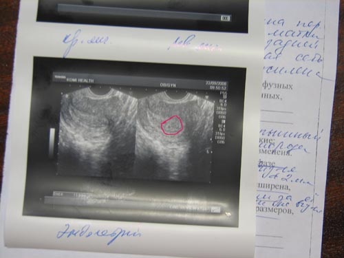 Сложив все за и против......через пол года, на тесте появились заветные 2 полоски. От счастья, бегала по квартире (со слезами на глазах). Тестов сделала 7 штук, для проверке. )))) Пошла к Кузнецовой на узи, она сказала, что похоже на беременность (срок был очень маленький). Через неделю, пошла к Кировскому врачу, на что она сказала, беременности нет, а есть включение (см.фото), но не беременность (к ней больше не нагой). Встала на учет. Вся беременность проходила на ура. Правдо один профессор, поставил ФПН, хотя признаков не было.