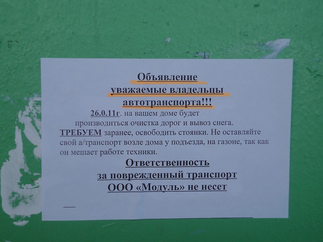 У нас помню писали на дверях что просят убрать свое авто чтоб не мешало уборке снега.