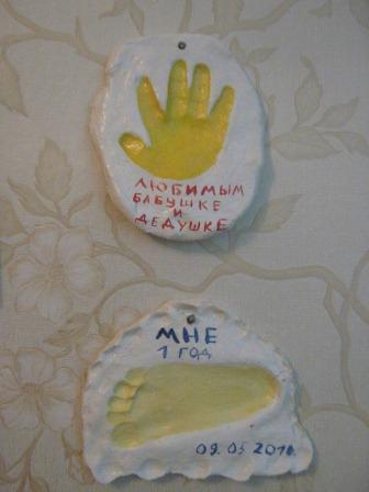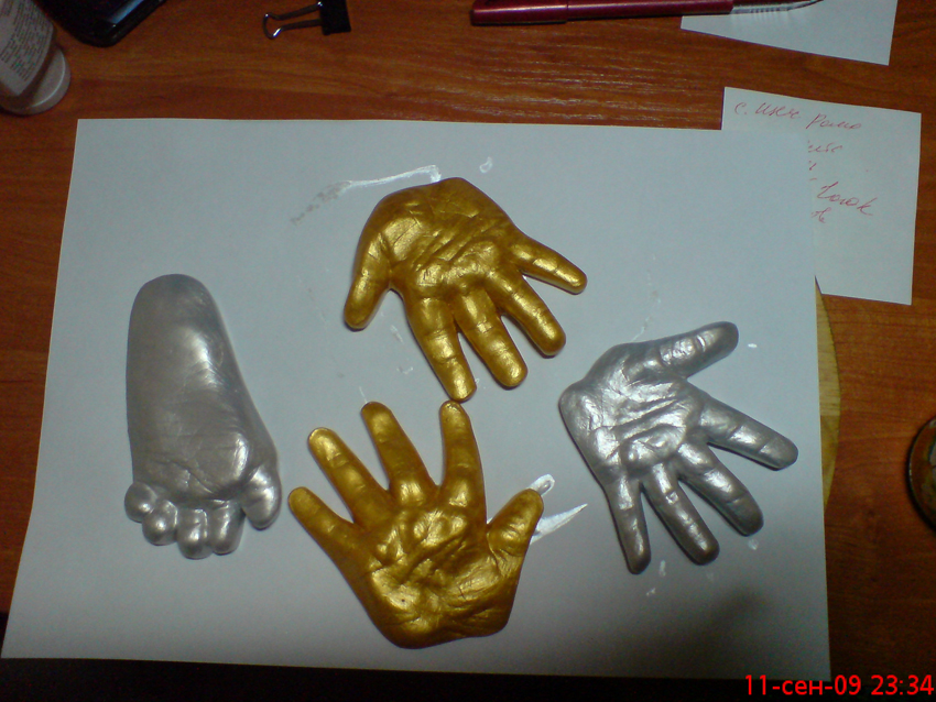Мы дома сделали тесто из соли с мукой, в него вдавили ладошки, потом полученный силуэт залили гипсом. Результат пока неизвестен. |
