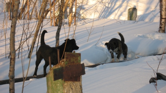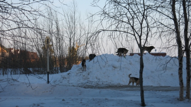 Zabava мы, наверное, об одних и тех же говорим собаках, вторая царственно сидела на снежной горе и наблюдала свысока за проиходящим. -Наших собак бооольше, да и покрупнее будут. Даже не знаю, гордиться или плакать.:-) Ох, их и мнооого около бизнес-центра тусуется на улице Мира. Резвятся, носятся... я близко подходить побоялась. Зато они ничего не боятся, когда наигрались, перебежали дорогу и на поиск пропитания. Парочку сфотографировала, эти ревизию по Мира 9 устраивали. Еще на территории второй школы трёх собак увидела. Удачной фотографии не получилось. Как-то собаки мою просьбу встать друг к другу поближе и улыбнуться проигнорировали. Я всё равно рядышком покрутилась и двух еще раз сфотографировала. |