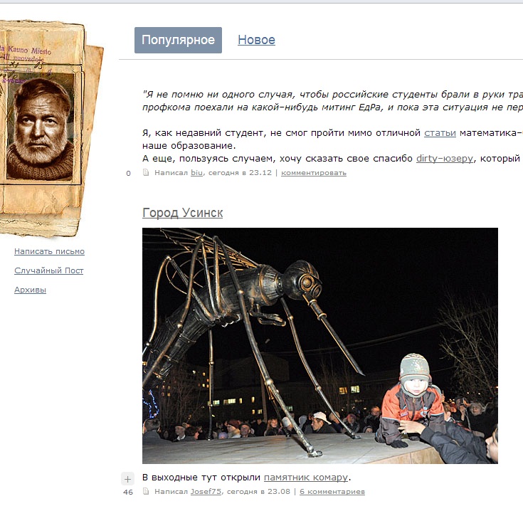 А как у нас продвигаются дела с памятником комару? Только сегодня узнала, что это не усинское ноу-хау. Как минимум, в Бердянске и Ноябрьске есть такие монументы Открытие 13-го октября. п.с. в Ноябрьске дизельпанк какой-то! Восхищен! -------------------- Мой Твиттер: https://twitter.com/mexbaza