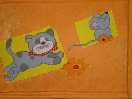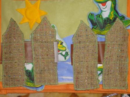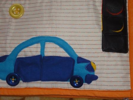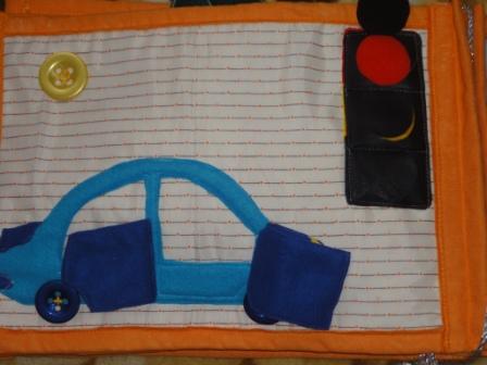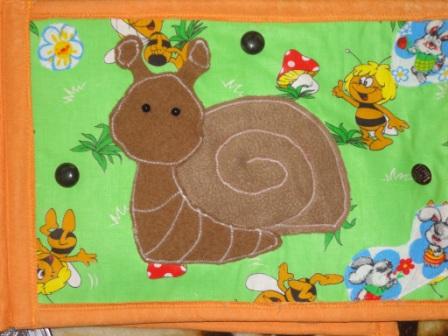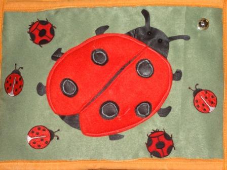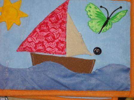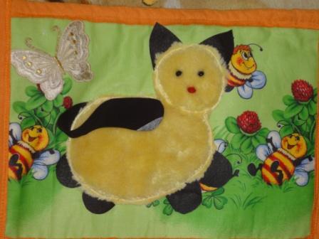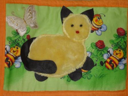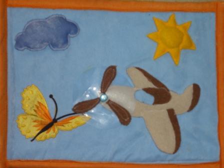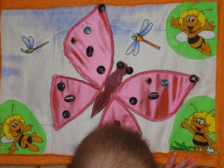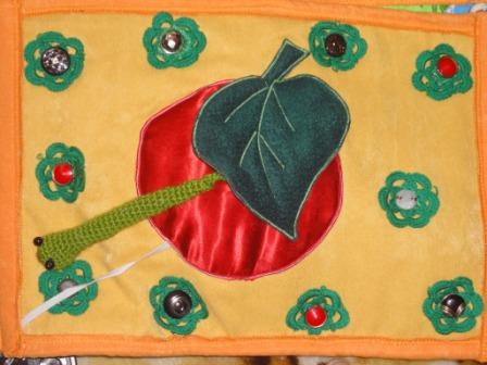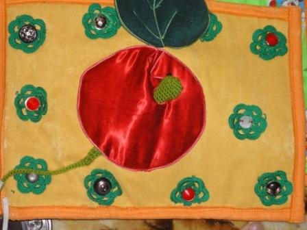 Приняли участие все - папа придумывал некоторые сюжеты и создавал эскизы, бабушки помогали с материалами и с пришиванием пуговочек и липучек. В использовании сегодня второй день. Дочке нравится, хотя некоторые детали вызывают бурное негодование по причине своей неотдираемости и неоткусываемости. Это обложка. Хотелось сначала вставить туда фото дочи, но потом решила что книжка должна стираться полностью поэтому место для творения осталось))) Первая страничка. Яблоня... ну или что получилось. Яблочки на липучках. Все отрываются, но пока мы еще не умеем, хотя мама активно учит Вторая страничка. Яблоко увеличенное. Под листиком - гусеница прячется. Вытягивается и обратно можно запряать потянув за резинку Третья страничка - бабочка. Пуговки пришиты крепко. Просто подергать, погладить, посмотреть. Четвертая страничка - улитка. У нее в домике зашита бусинка. Можно покатать по лабиринтику. Ну и пуговки конечно дергательно-кусательные. Пятая страничка - пруд с лягушками. За воротами, которые в будущем будут зашнуровываться. Пока еще не доделана. Шнуровка пока отсутствует. Лягушки, солнышко на липучке. Шестая страничка - кораблик. Паруса отгибаются и за ними сюрприз - зайки. Один парус на липучке - другой на пуговке, солнышко тоже на липучке. Борт, волны - кармашки. Туда, как оказалось, прекрасно помещается игрушка дельфин. Ну можно и еще что-нибудь прятать, по желанию Седьмая страничка - божья коровка и ее детки. Детки - термоаппликации, божья коровка - из кожи и флиса. Тоже кармашком получилась. Так... потрогать, подергать пуговки, бусинки, усики Восьмая страничка - типа кошка. Папа говорит недоцыпленок. Но с хвостом. За хвостиком прячутся лапки. Кошка из меха. Потискать можно. Девятая страничка - машинка и светофор. У машинки открываются обе дверки, можно садить пассажиров (есть кармашки), светофор может показывать сигналы или стоять сломанным (никаких сигналов). Типа солнышко большая пуговица. Конечно же дергательная. Десятая страничка - самолетик. У него вертится пропеллер, кабина приспособлена для приема на борт пассажиров, солнышко и тучка на липучке. Все. конец. Вот такая книжка получилась. Сюжеты сплагиатила частью, частью - фантазия папы. Пока шила - еще появилось множество идей, книжку можно было сделать и 20тистраничной, но решила оставшиеся идеи использовать при создании коврика. |