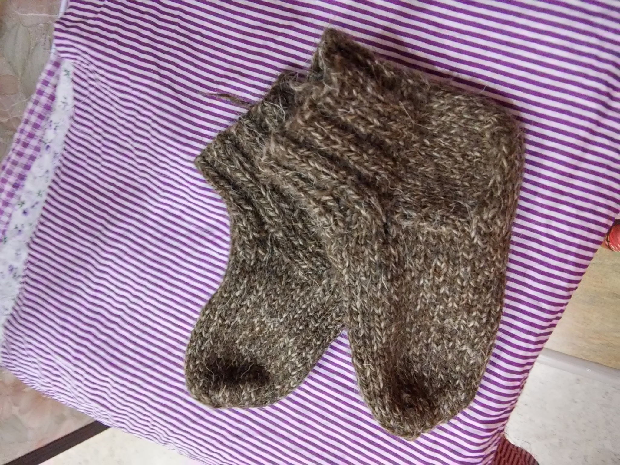 Выглядят немного корявенько, но это потому что еще не стираны. После стирки пряжа немного подваливается, уплотняется и распушается. Будут практически валенки.
