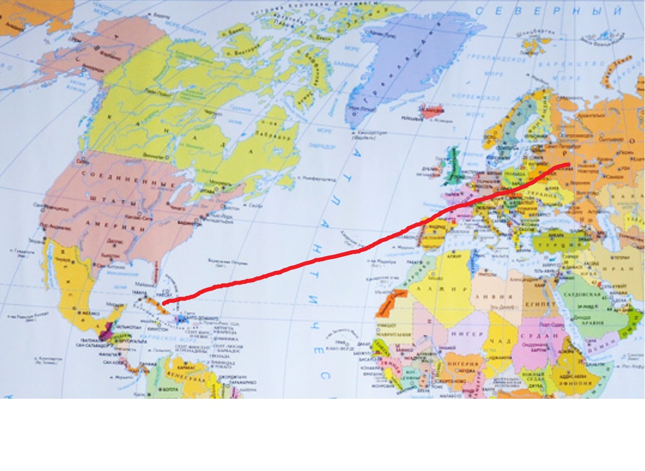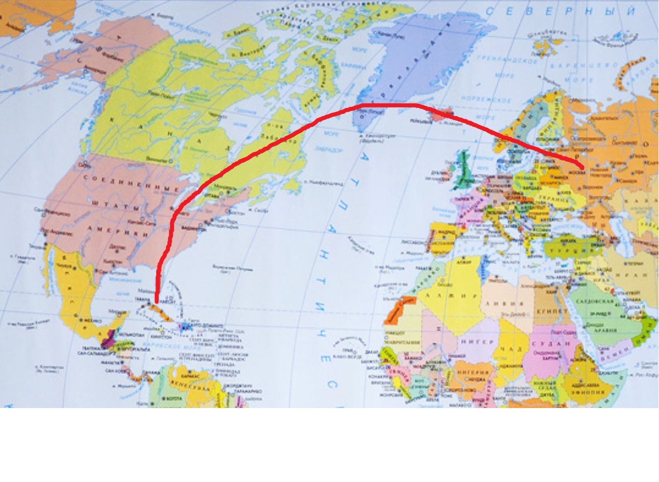 Меня перелеты над водой пугают) Типа над землей безопаснее)))) А с чего ты взяла, что он полетит прямо над водой-водой ? Я тоже думал, что на Кубу он рванёт на прямую через океан, ну потому что так короче и быстрее : А на самом деле он летел вот так, ну видимо для того, что бы в случае чего можно было запросить аварийную посадку : |