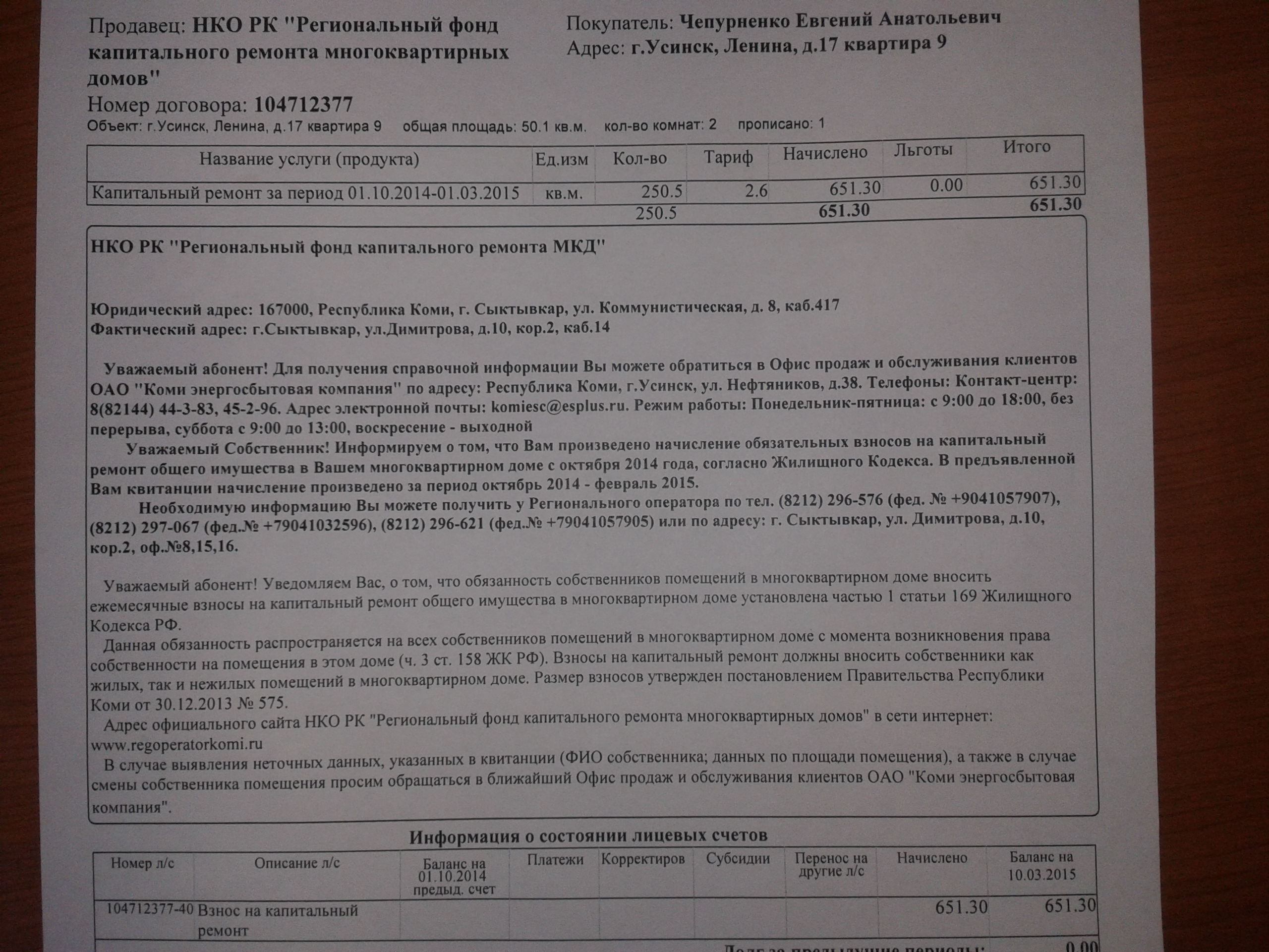 Получил странную квитанцию за "Капитальный ремонт за период 01.10.14-01.03.15