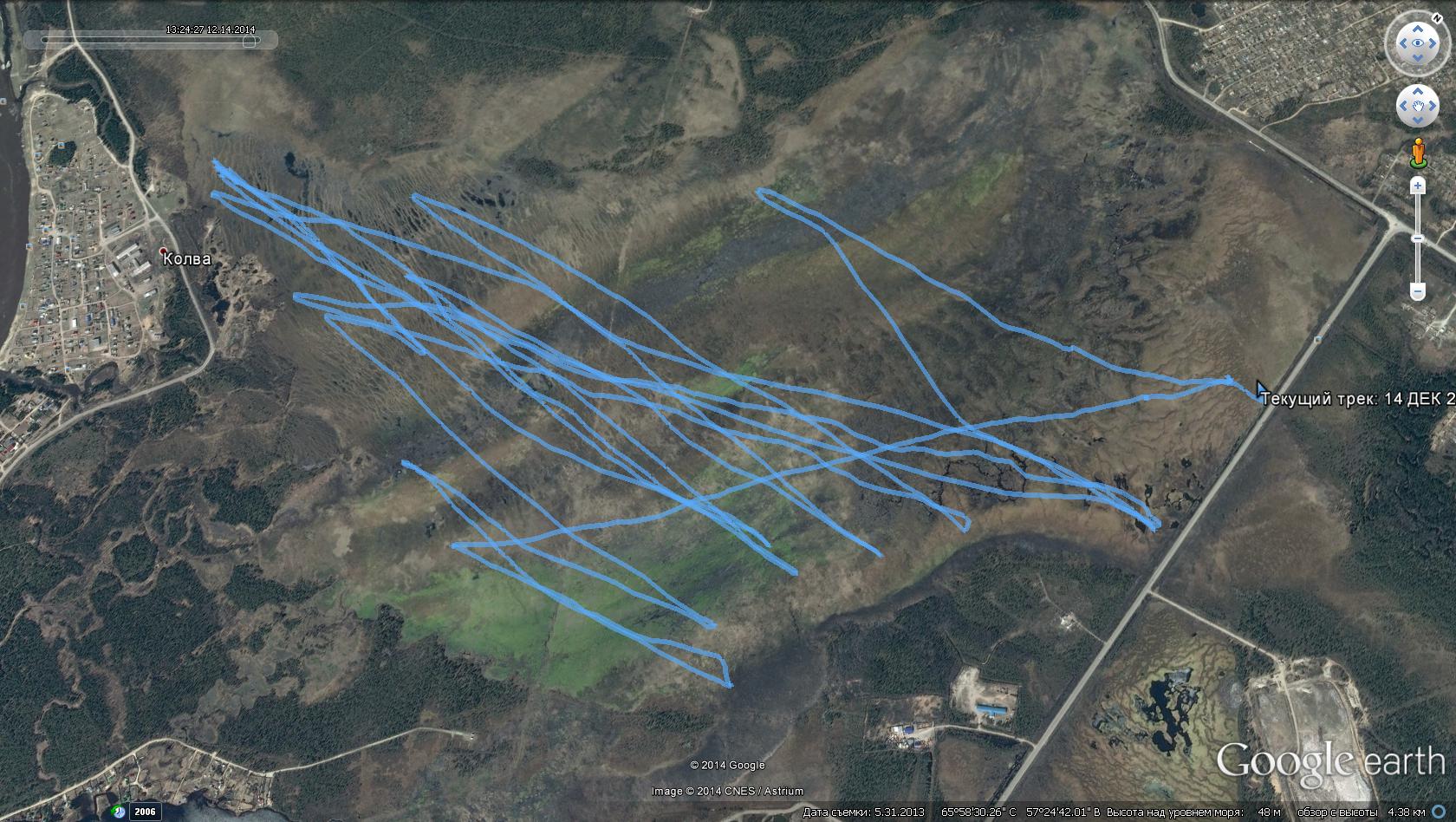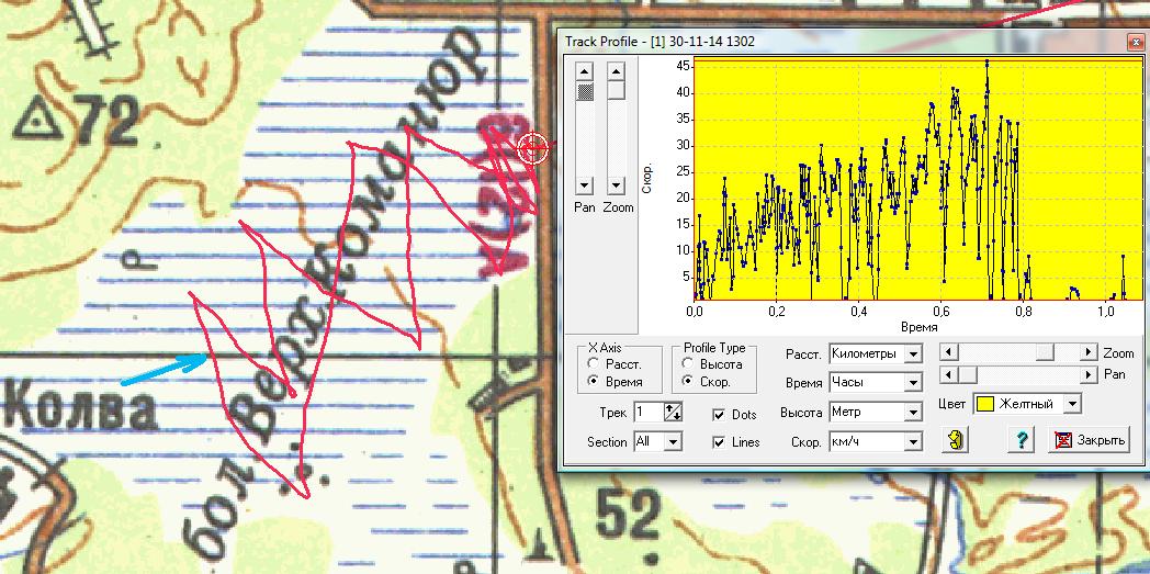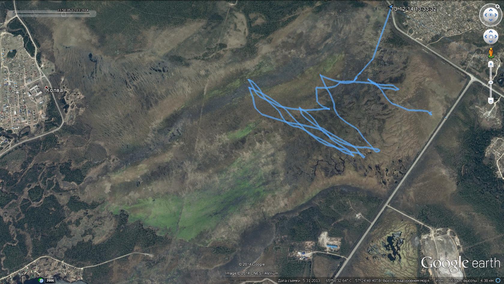 Все, созрел, на следующий раз беру большой, пора уже осваивать... И ошибся, и не покатался потому, что не взял привычный размер. 26 ноя день "Мустанга", посади на дикого скакуна молодого наездника как раз так и получится. Необычно к ночи ветер только крепчал. Кое какой компромис удалось найти на коротеньких стропах (7м). И это только для относительно контролируемого удержания. Закончилось тем, что лопнуло металическое кольцо тяговых строп. В результате сделан первый шаг к переходу на надувастик. Было опасливо, но мне понравилось. Сегодня суббота, по настоящему кайтовый день. Первый выход на болото. Ветер ю-з до 7м\с, парафойл 8-ка, до колвинского берега семь галсов и один назад, пол часика "трамваинга" вдоль пармской дороги. Все настолько комфортно, что возникало желание взять что-нибудь, а лучше кого-нибудь на прицеп. Из фактов 34км общего пути, макс. скорость 40км\ч, время в движении 2ч20мин; от дома до дома по времени прогулка уложилась в 4 часа. На реку пока еще рановато, под снегом есть промоины. Фото нет, так хоть рисунки, все лучше чем, ничего. Наконец-то получилось слить трек на комп. Сообщение отредактировал bazun - 4.12.2014, 14:48 -------------------- После нас сегодня чище, чем вчера. Тело должно двигать себя само.