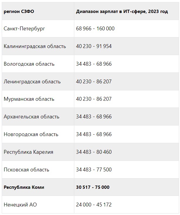 Количество вакансий в регионе увеличилось почти в два раза по сравнению с аналогичным периодом прошлого года. В среднем за работу готовы платить от 45 тыс. до 80 тыс. рублей. Аналитики hh.ru изучили рынок труда в Республике Коми и выяснили, что спрос на специалистов ИТ-сферы значительно вырос за последний год. Наиболее востребованными специалистами в ИТ-cфере по итогам первых двух месяцев 2022 года в Коми стали: инженер (70% от общего числа вакансий), специалист службы поддержки (45%), системный администратор (43%), а также программист-разработчик (42% вакансий). Предлагаемая заработная плата для данных специалистов составила 80 тыс. руб., 30 тыс. руб. 35 тыс. руб. и 72 500 соответственно. Для ИТ-специалистов в Коми предлагаемая заработная плата выросла на 6000 руб. по сравнению с аналогичным периодом прошлого года и в данный момент составляет 45 тыс. руб., все же оставаясь ниже среднерыночной заработной платы на 19 тыс. руб. Ожидаемая заработная плата жителей Коми увеличилась по сравнению с аналогичным периодом прошлого года на 12% и составила 52 200 руб. Рейтинг «дорогих» вакансий в ИТ-сфере в Коми: 1. PHP-разработчик (Yii2), до 140 тыс. руб. на руки. 2. Программист универсал/системный администратор, до 100 тыс. руб. до вычета НДФЛ. 3. Java разработчик, от 100 тыс. руб. на руки. Вакансии для ИТ-специалистов без опыта работы в Коми: 1. Backend-разработчик, от 25 тыс. до 45 тыс. руб. на руки. 2. Специалист по автоматизации (системный администратор), от 47 тыс. руб. до вычета НДФЛ. 3. Junior разработчик (поисковая выдача), до 75 000 руб. на руки. -------------------- "Я люблю этот город, но зима здесь слишком длинна" (С)